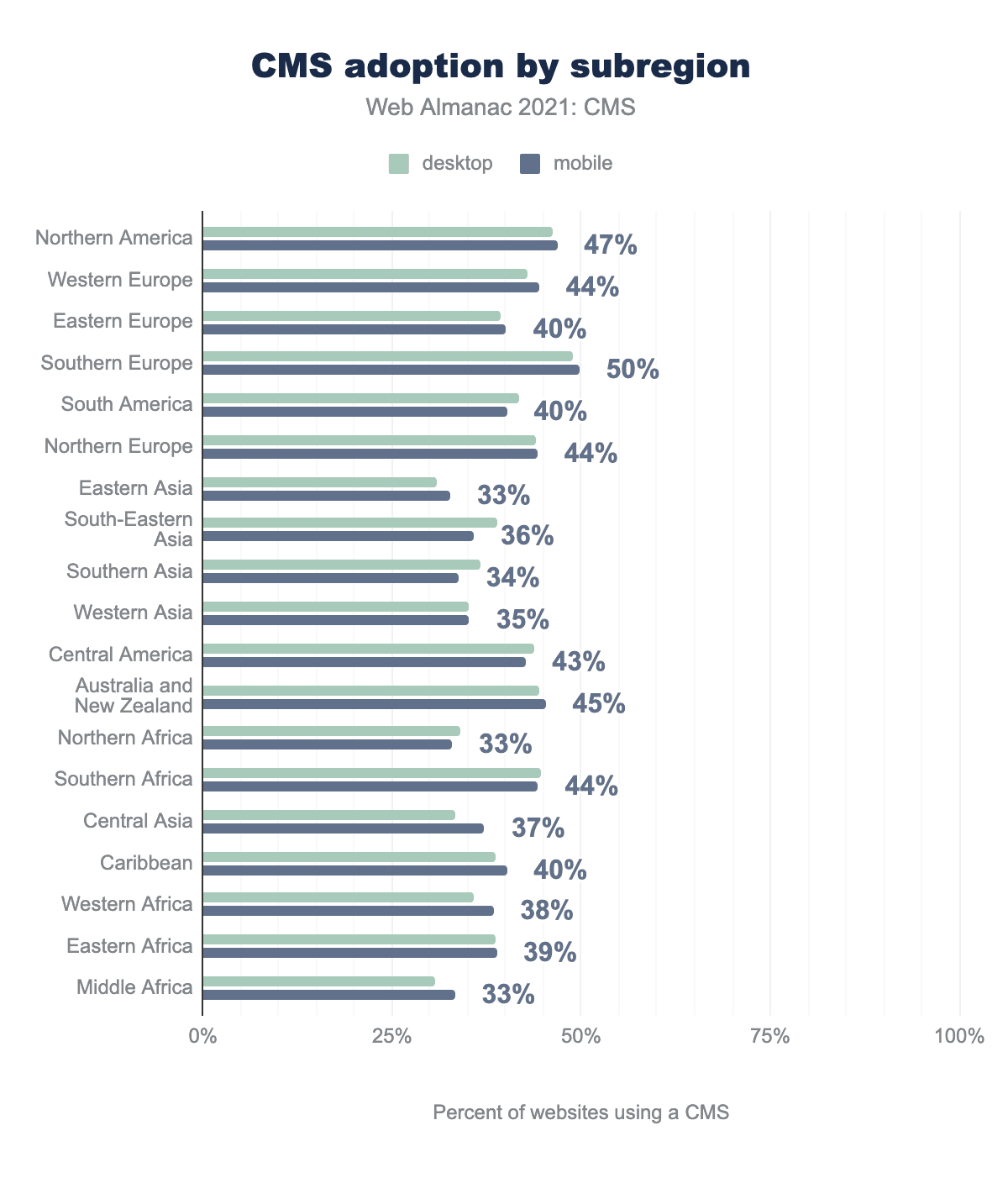 Adoption is highest in Southern Europe where half of the sites are using a CMS, and lowest in Eastern Asia where only a third of sites in our dataset use a CMS.