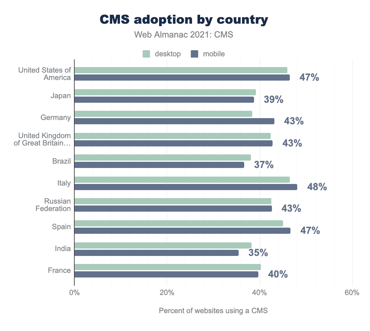 Among the geographies with the highest number of websites, CMS adoption percentage is the highest in the US, Italy, and Spain, where 46%–47% of mobile sites visited by users are built with a CMS. India and Brazil have the lowest adoption with only 35% and 37%.