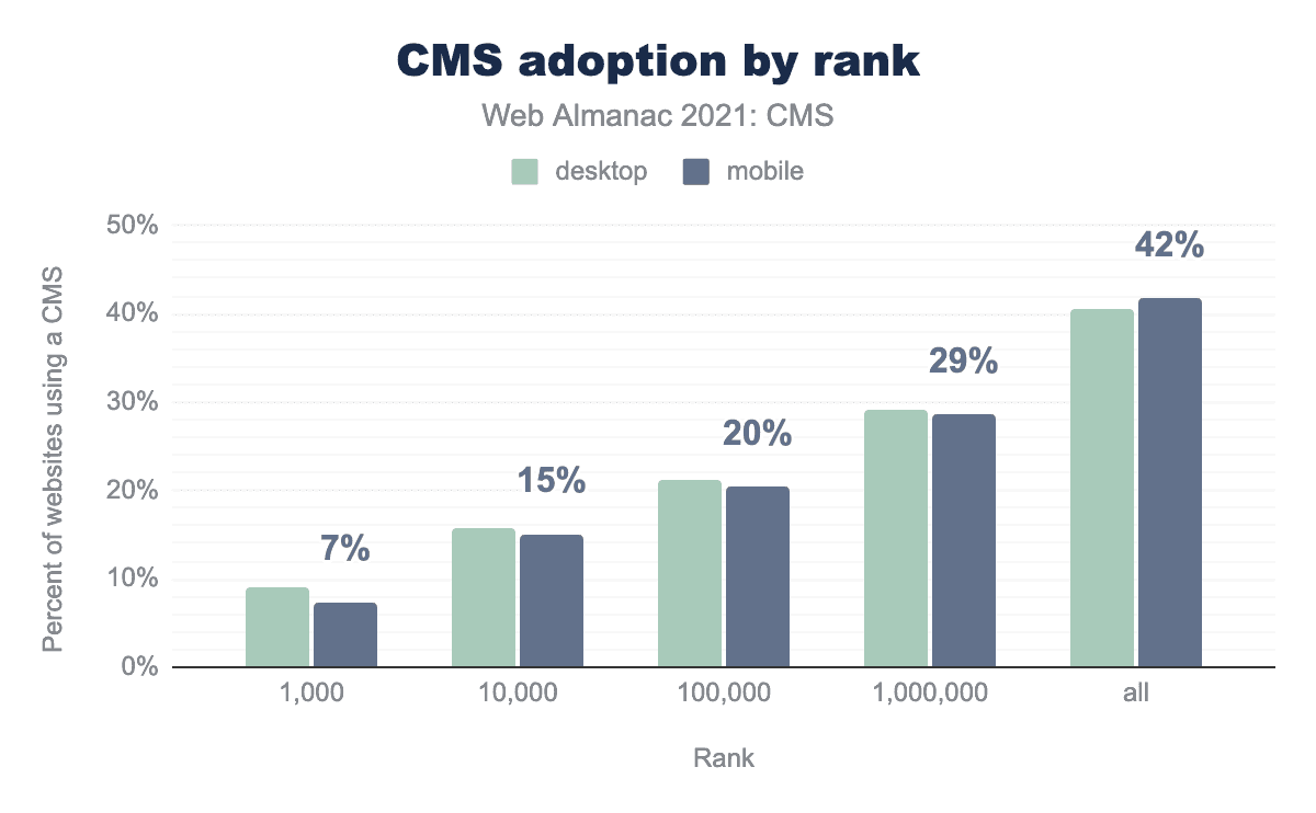 As of July 2021, over 45% of public websites are powered by a CMS platform, indicating growth of over 7% from 2020. This breaks down to 45% on desktop, up from 42% in 2019, and 46% on mobile, up from 42% in 2020.