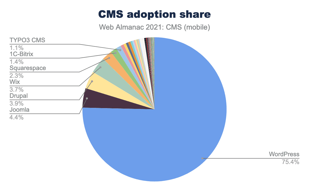 Among all websites that use a CMS, WordPress sites account for a large part of the relative market share, with over 75% adoption, followed by Joomla, Drupal, Wix, and Squarespace.