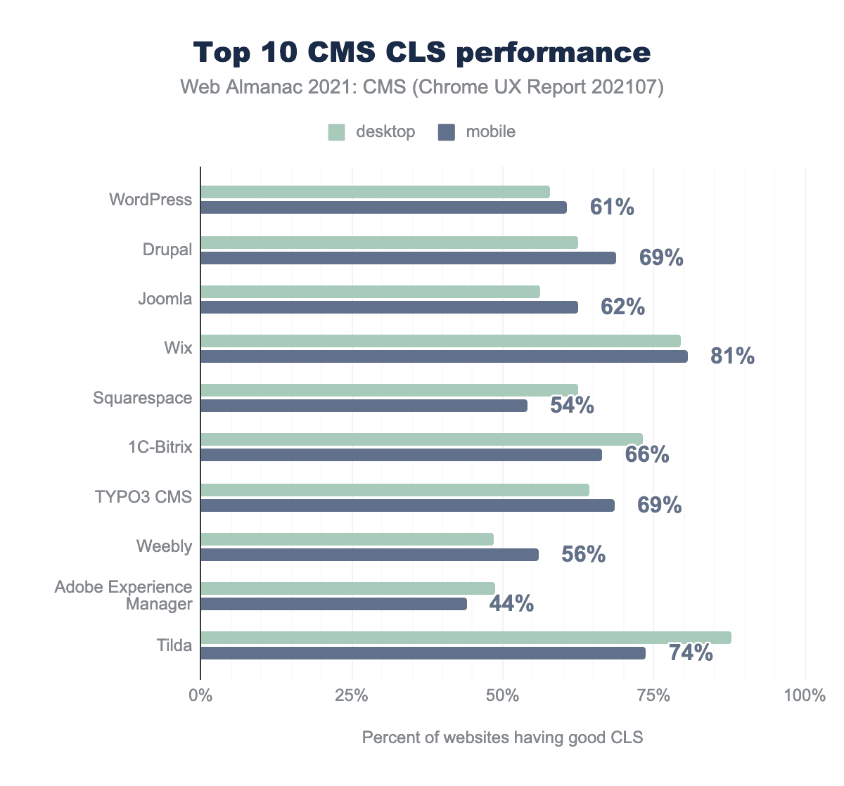 Comparing yearly data, we can see that most CMSs made some progress, or benefited from the change to a windowed CLS metric. However, we can see that certain CMSs such as Weebly regressed in CLS scores over the past year.