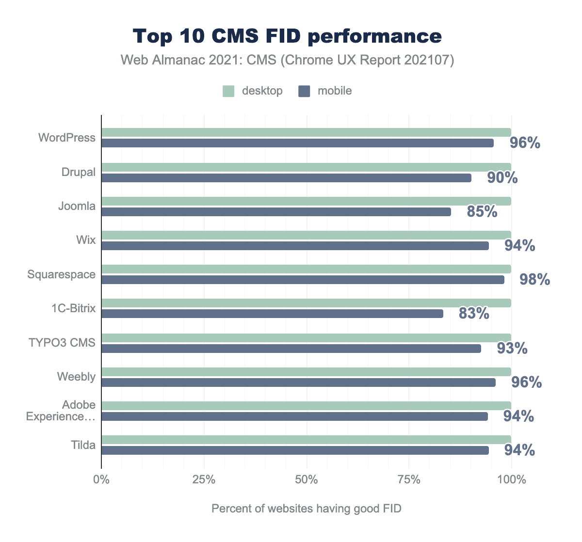 FID is very good for most CMSs on desktop, with all platforms scoring a perfect 100%. Most CMSs also deliver a good mobile FID of over 90%, except Bitrix and Joomla with only 83% and 85% of origins having a good FID.