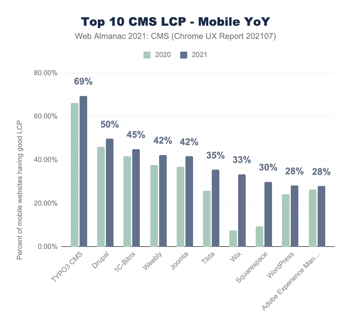 Figure 16.11. Top 10 CMSs LCP performance for mobile views year-over-year.