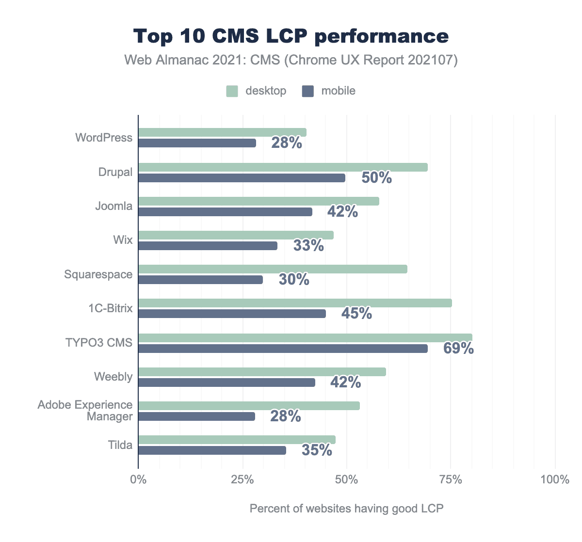 TYPO3 CMS had the best LCP scores with 69% of origins having a “good” LCP experience, while WordPress and Adobe Experience Manager have the worst LCP scores, with only 28% of origins having a good LCP score.