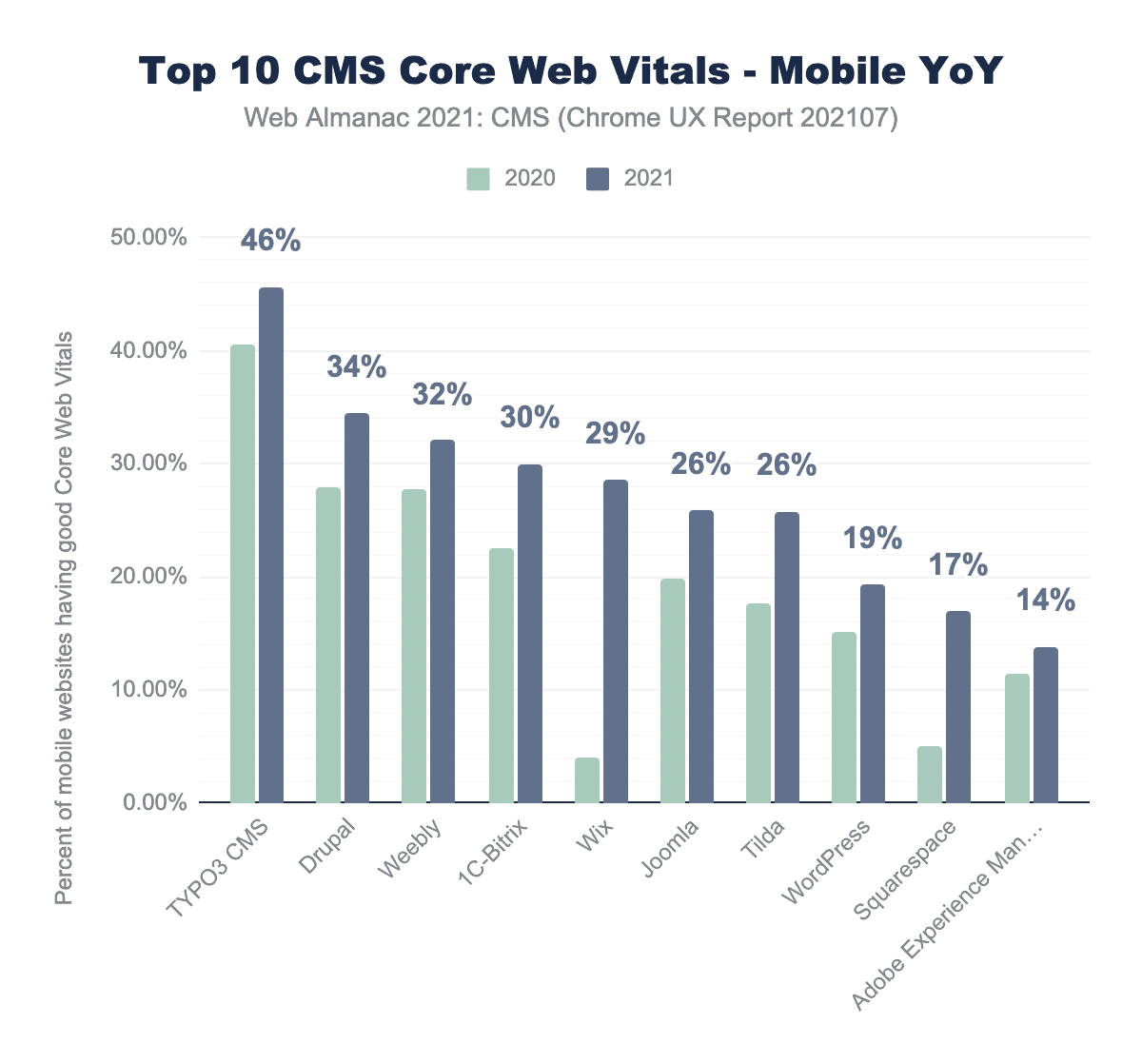 Figure 16.9. Top 10 CMSs core web vitals performance for mobile views year-over-year.