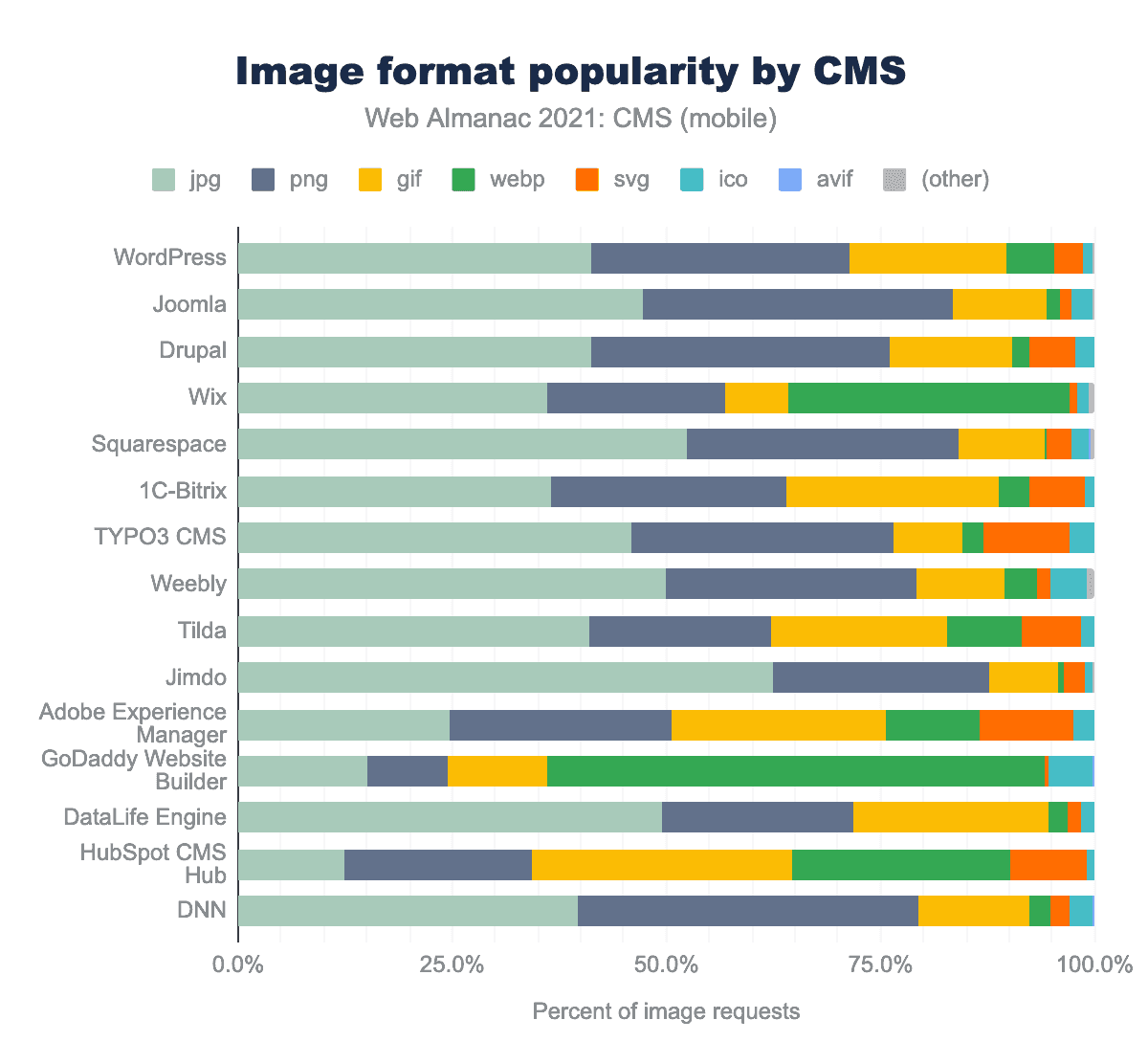 GoDaddy Website Builder and Wix make the most use of WebP, with ~58% and 33% adoption respectively, while WordPress, Joomla, and Drupal barely serve WebP–only ~5.7% of images served by WordPress sites are WebP. AVIF is barely used by these platforms, with less than ~0.1% on all platforms.