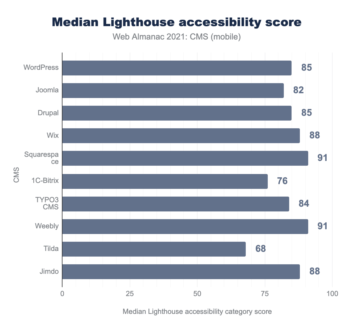 The median Lighthouse accessibility score for the top 10 CMSs ranges between 76 and 91. Squarespace and Weebly have the highest scores of 91, while Tilda had the lowest accessibility scores.