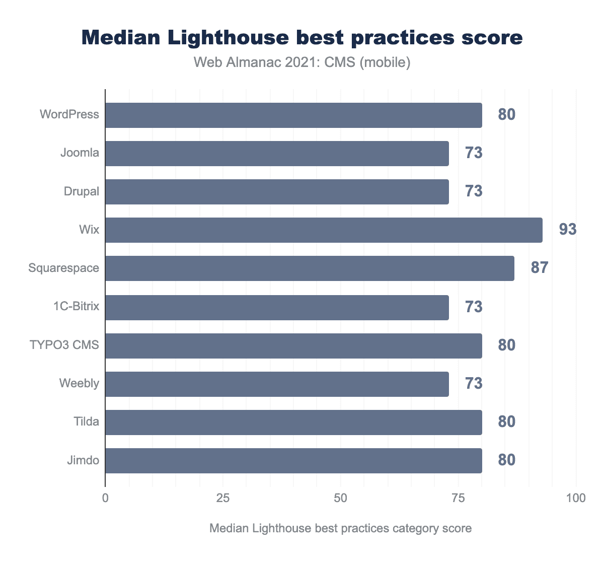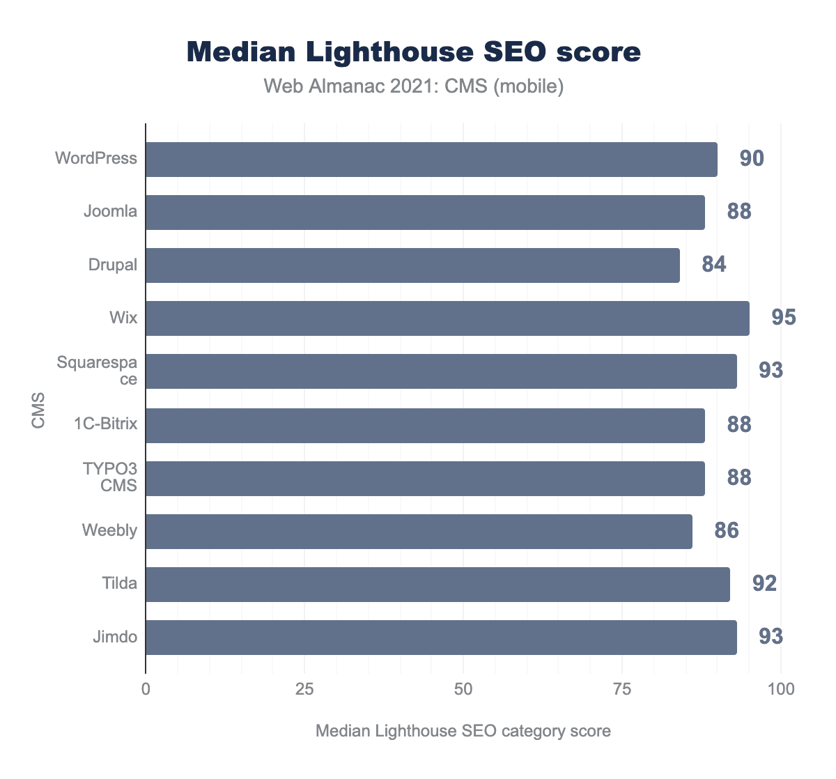 The median SEO score in all of the top 10 platforms is over 84, with Drupal scoring the lowest and Wix scoring the highest with a median score of 95.