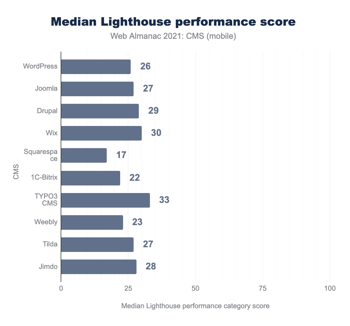 We can analyze this data to provide another perspective on CMS performance, using the results of these synthetic tests, which also include metrics that are not tracked in CrUX.