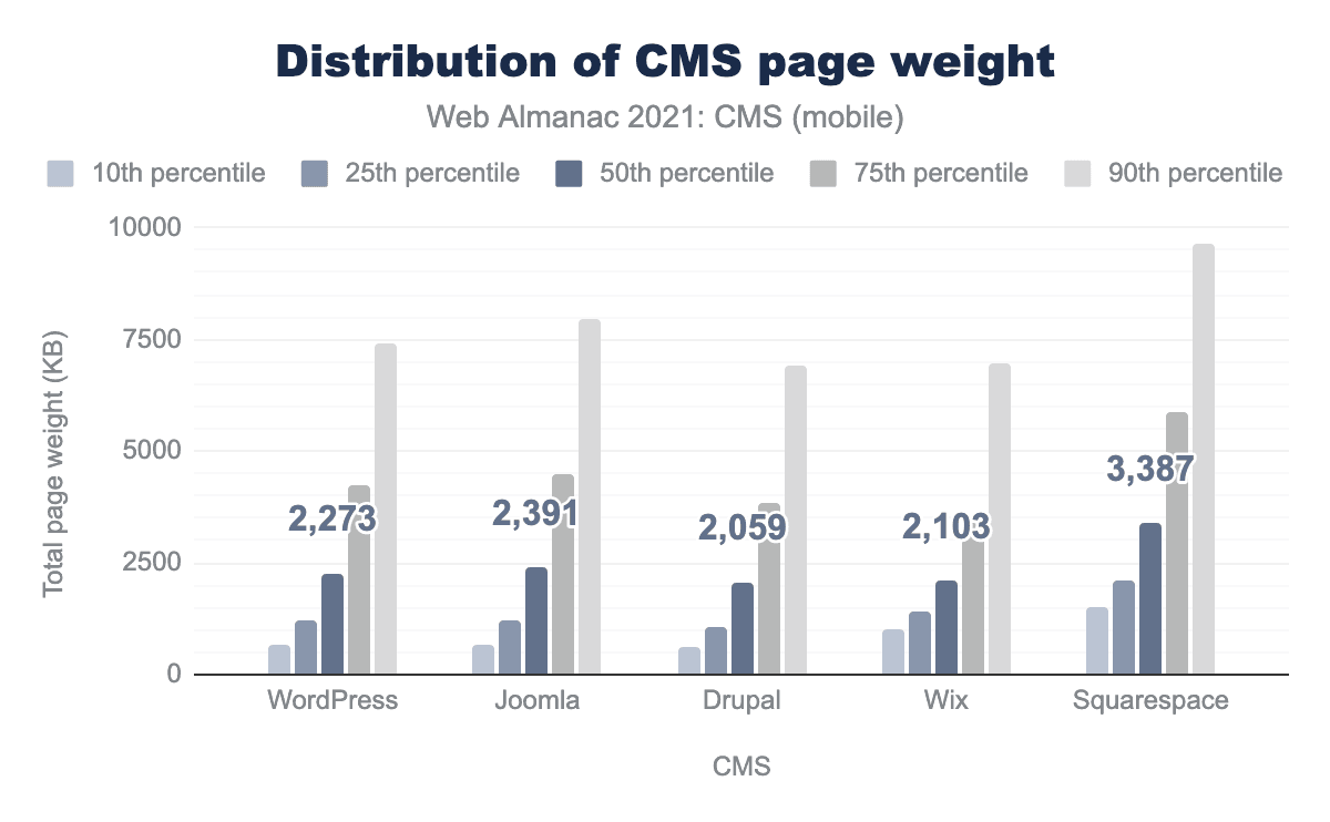 The distribution of page weight in each platform’s percentiles is substantial, probably related to the difference in user content across different web pages, the number of images used, plugins, etc. The smallest pages delivered per platform come from Drupal, which only sends 595 KB for their 10th percentile of visits. The largest pages come from Squarespace, with ~9.6 MB delivered for their 90th percentile of visits.