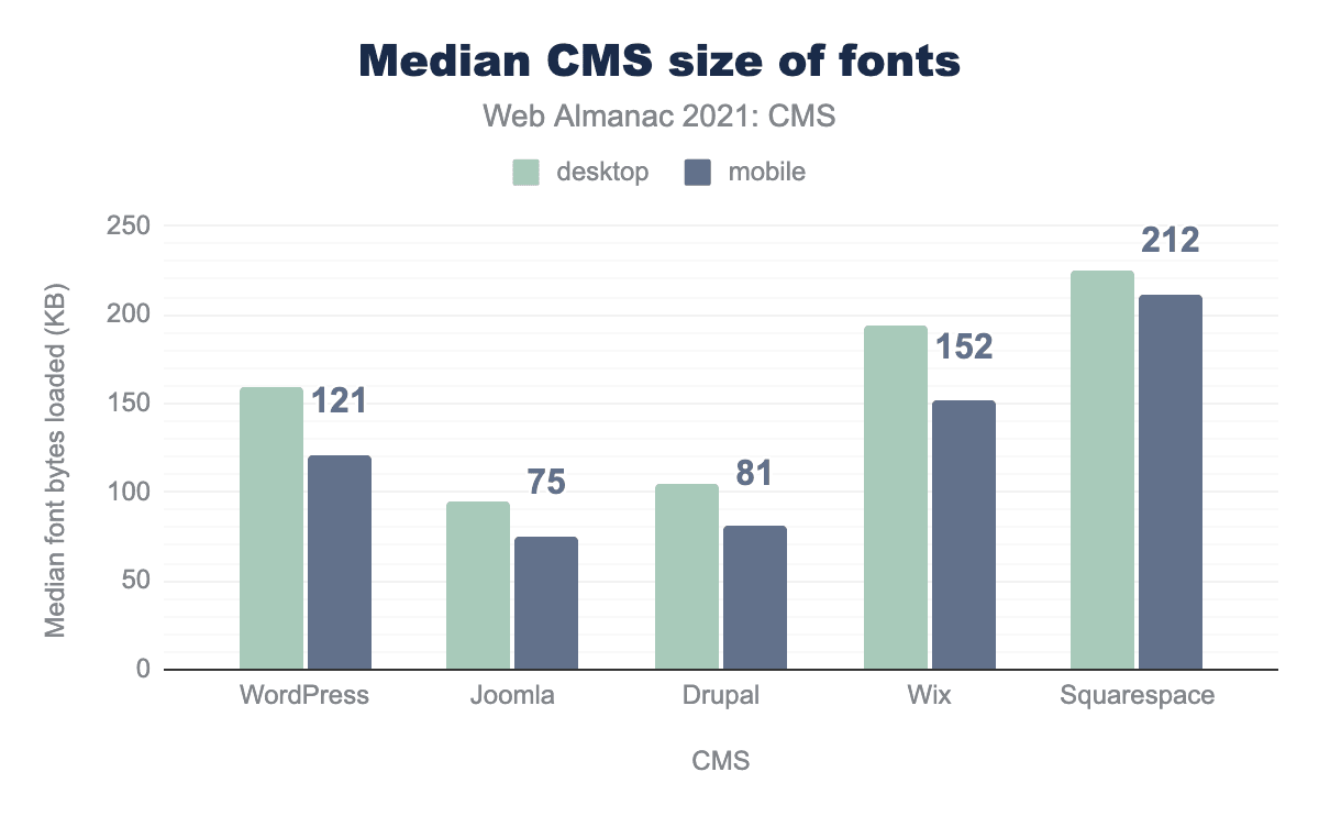 To display text, web developers often choose to use a variety of fonts. Joomla delivers the fewest font bytes, with 75 KB on mobile views, and Squarespace delivers the most with 212 KB.