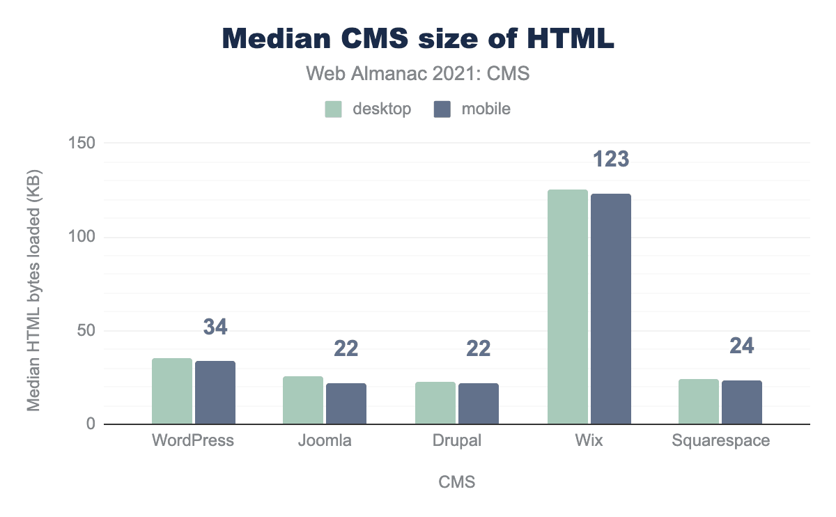 The largest five CMSs all deliver pages that rely on JavaScript, with Drupal delivering the least amount of JavaScript bytes–372 KB on mobile, while Wix delivers the most JavaScript bytes, over 1.1 MB.