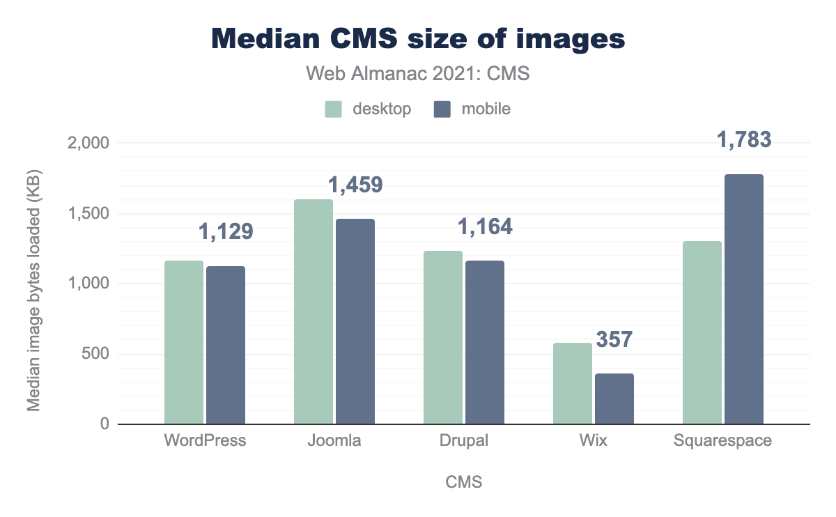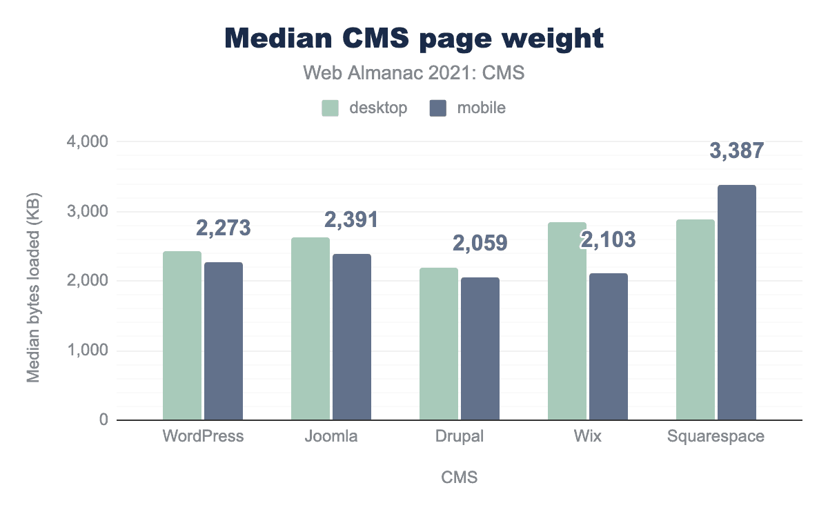 Most of the top 5 CMSs deliver a median page weight of around ~2 MB, except Squarespace which delivers a larger ~3.3 MB. Squarespace is the only platform that delivers more bytes in mobile views than on desktop.