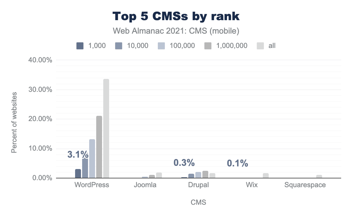 3.1% of mobile sites in the top 1K are built with WordPress, and 33.6% of all sites. Drupal maintains a higher adoption rate within the mid-ranged rankings (10K–1M), while most of Wix and Squarespace sites are ranked outside the top 1M sites.