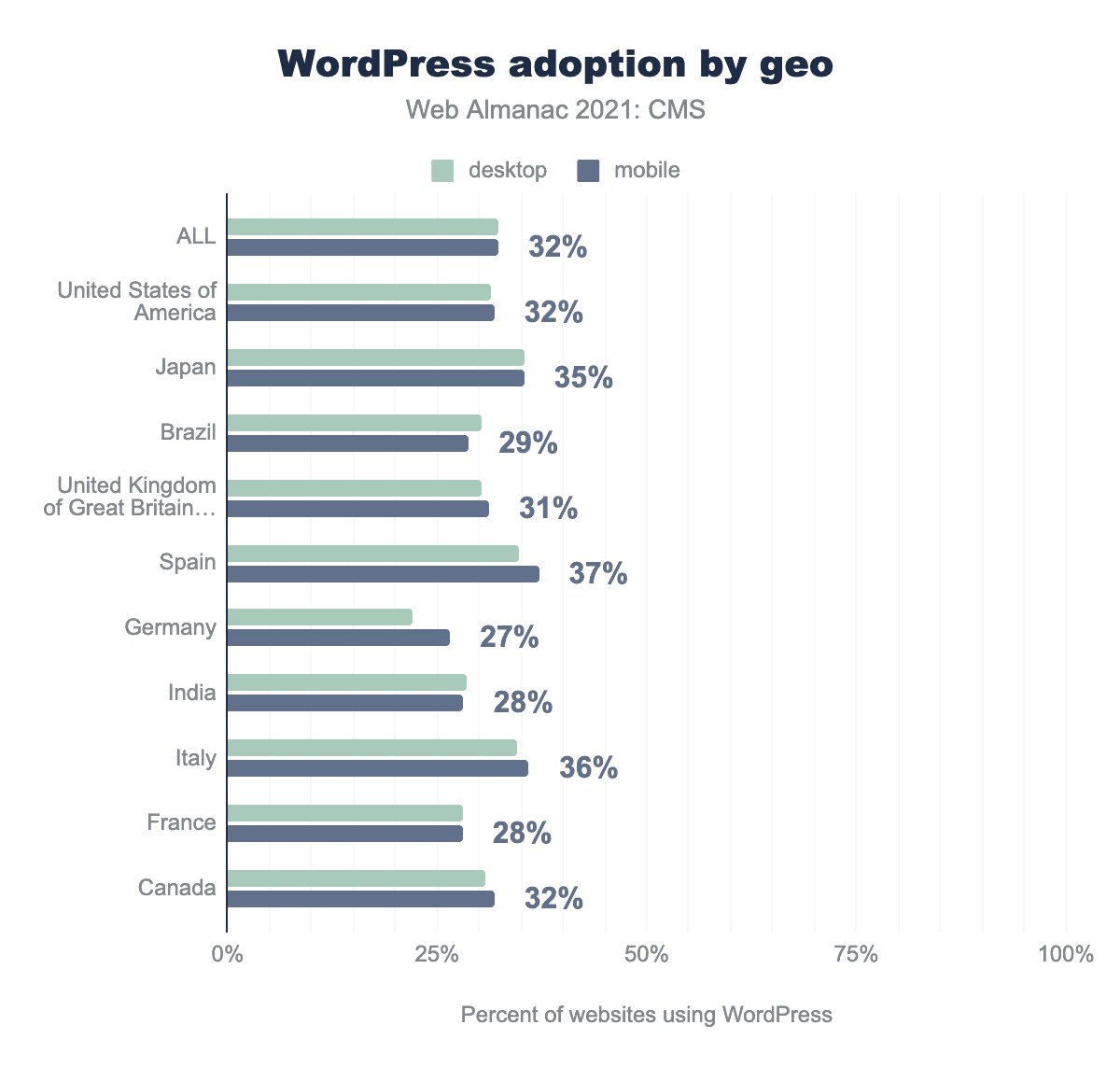 In the top 10 countries with the most sites in our dataset, WordPress had over 27% adoption. Spain had the highest WordPress adoption among these countries with 37% of mobile pages using WordPress, compared with Germany where only 28% of mobile pages used WordPress.