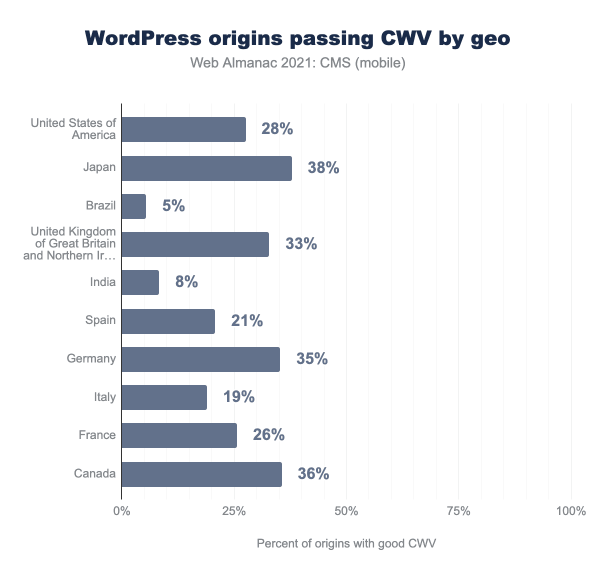 We can see that while WordPress was passing on 19% of the total origins counted across all countries, WordPress sites are passing in a very different percentage in various countries. In Japan, 38% of sites have good CWVs for mobile visitors, but in Brazil, only 5% have good CWVs.