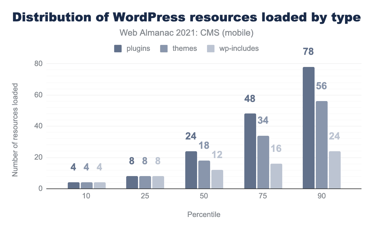 The median mobile WordPress page loads 24 resources under the /plugins/ path, 18 resources under the /themes/ path, and 12 resources under the /wp-includes/ path. In the 90th percentile, we see a huge amount of resource requests, with 78 plugin resources, 56 themes, and 24 wp-includes!