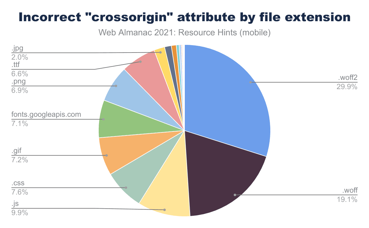 woff2 is 29.9% likely. woff is 19.1% likely. js is 9.9% likely. css is 7.6% likely. gif is 7.2% likely. fonts.googleapis.com is 7.1% likely. png is 6.9% likely. ttf is 6.6% likely. jpg is 2.0% likely.More than half (63.6%) of the cases when the crossorigin attribute on the rel="preload" hint is either missing or incorrect, are linked to the preloading of font files, with a total of 14,818 instances across the dataset.