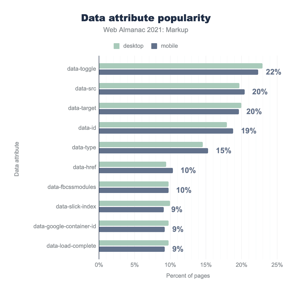 data-toggle is used on 23% of desktop and 22% of mobile pages, data-src on 20% and 20% respectively, data-target on 20% and 20%, data-id on 18% and 19%, data-type on 15% and 15%, data-href on 9% and 10%, data-fbcssmodules on 10% and 10%, data-slick-index on 10% and 9%, data-google-container-id on 10% and 9%, and finally data-load-complete is used on on 10% of mobile and 9% of desktop pages.Their popularity is high! Per the chart above close to every fourth document uses data-* attributes. But the overall data show that 88% of documents use at least one data-* attribute. That’s quite some adoption.