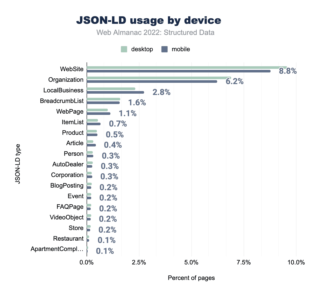 JSON-LD types continue to be mostly similar with a few notable increases over the previous year. Namely, these are LocalBusiness (which has increased to 2.8% of pages in our set) and Restaurant (which has increased to 0.3% of pages in our set).