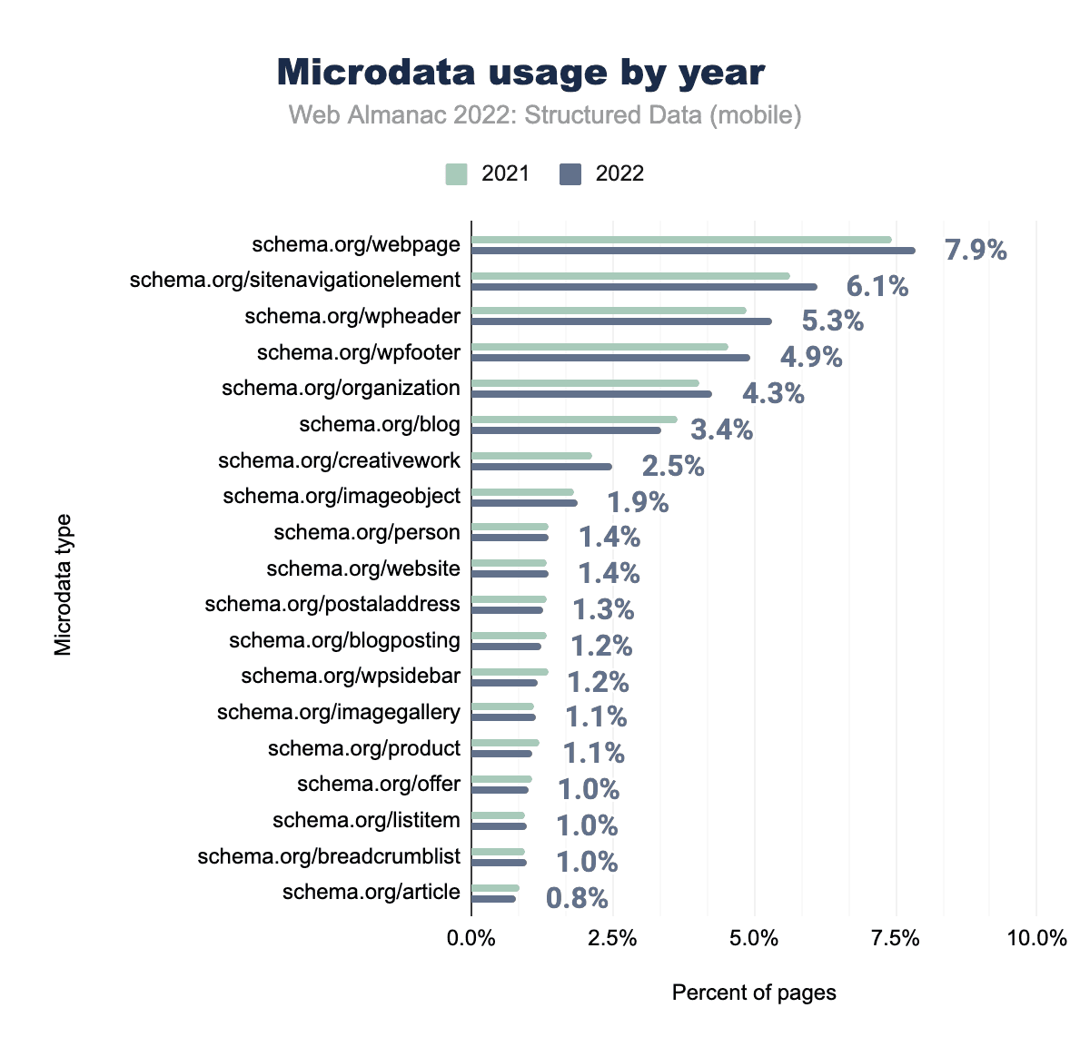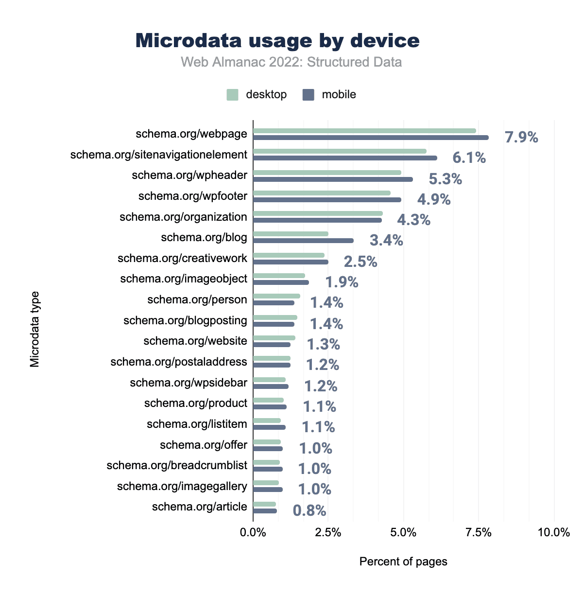 Most of the properties for Microdata have not seen much change, with a slight increase in some of the more common properties such as webpage, sitenavigationelement and wpheader appearing in 7.9%, 6.1% and 5.3% of mobile pages respectively.