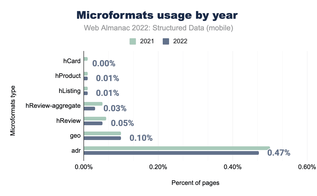 Microformats have remained very similar in usage numbers since 2021, with adr (appearing on 0.47% of pages in our set) still being the most common on the list.