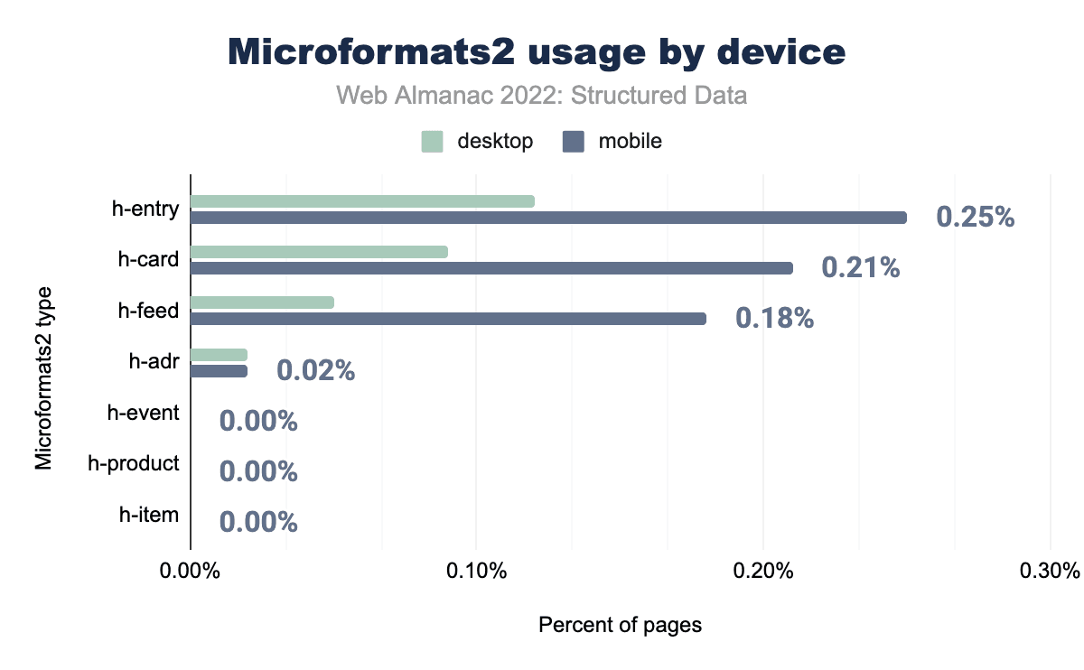 Both mobile and desktop share a mix of increased and decreased usage between microformat types, though both averaging out to less than last year’s numbers. Some types which factor into this decrease are hReview (going from 0.06% to 0.05% on mobile pages and 0.06% to 0.04% on desktop pages) and hReview-aggregate (going from 0.06% to 0.04% on both mobile and desktop pages).