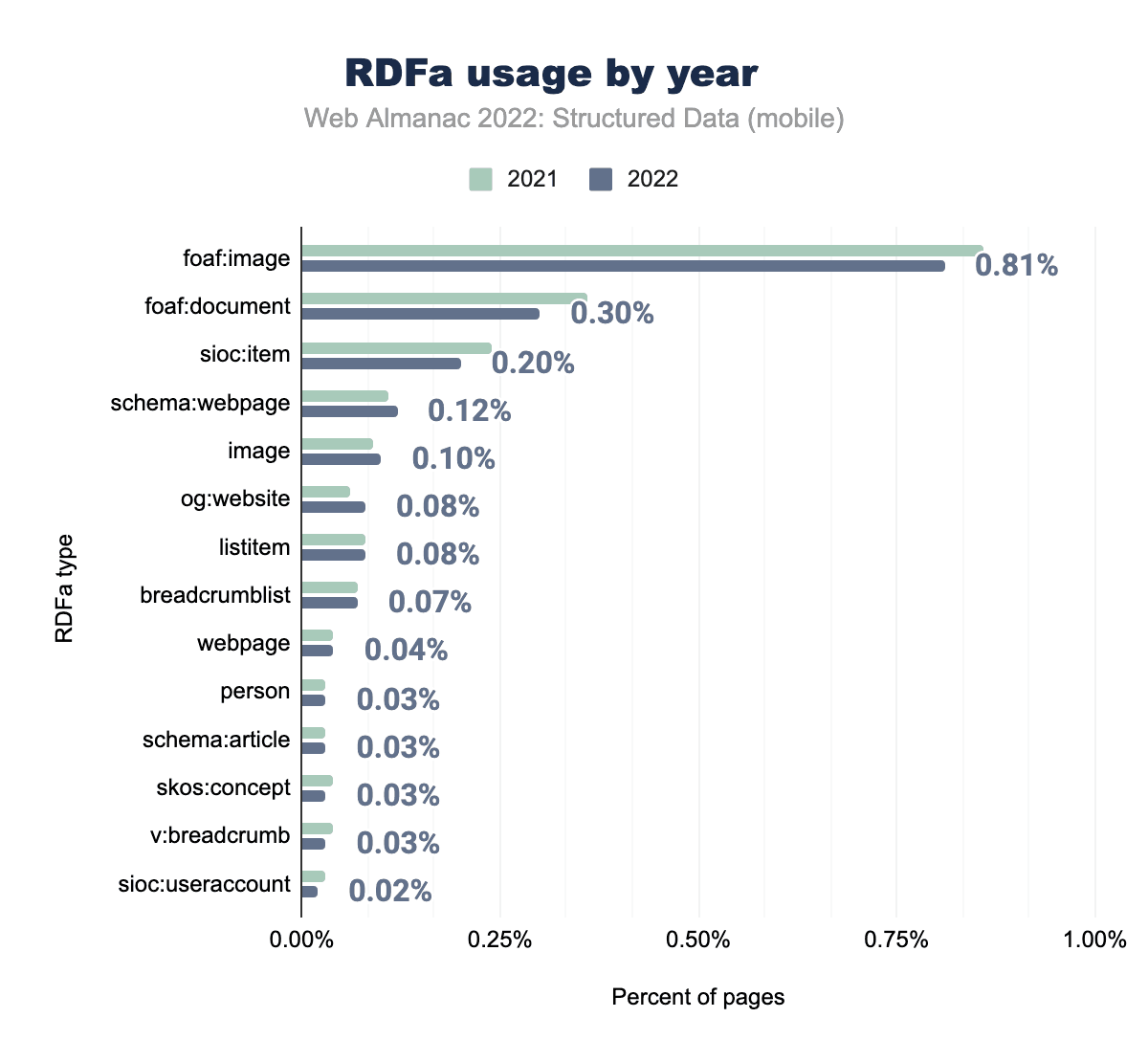RDFa remains more prominent on desktop with foaf:image appearing on 1% of desktop pages, compared to 0.81% on mobile pages. Other RDFa types saw a slight increase in appearance on desktop pages over mobile, with the exception of og:website reaching ahead with 0.08% on mobile pages and 0.07% on desktop pages.
