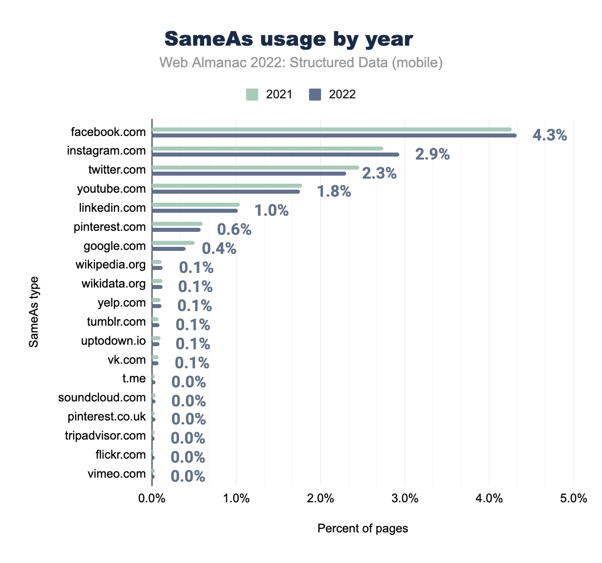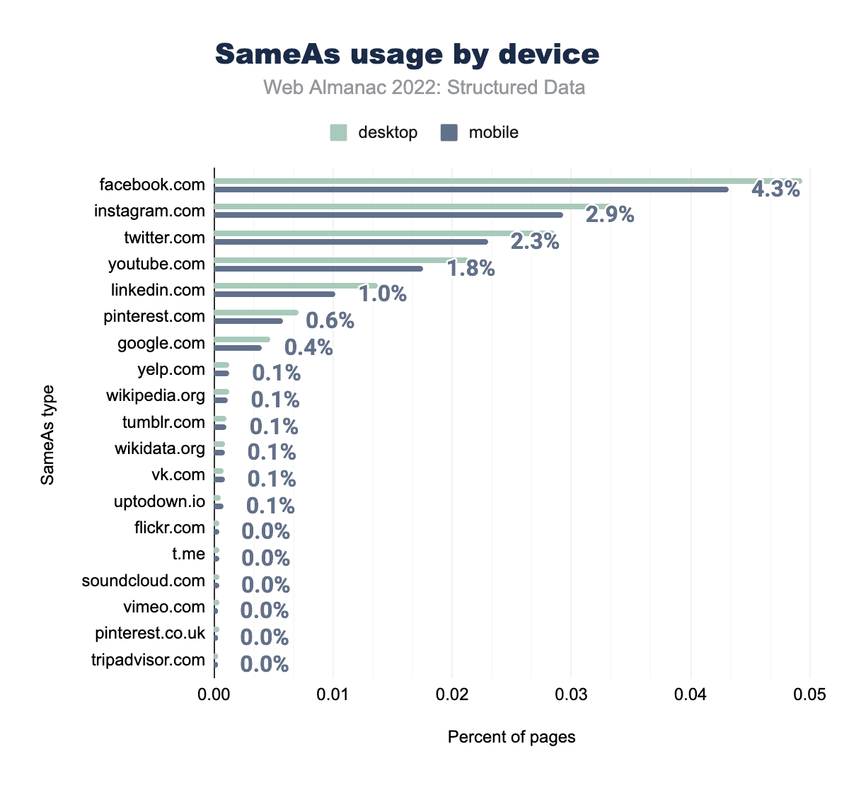 As was the case in 2021, the most common values of the sameAs property are social media platforms. These include facebook.com (at 4.32% on mobile and 4.94% on desktop), instagram.com (at 2.93% on mobile and 3.34% on desktop) and twitter.com (at 2.30% on mobile and 2.86% on desktop). The former two of which have seen a slight increase on mobile from 2021, with all 3 increasing on desktop.