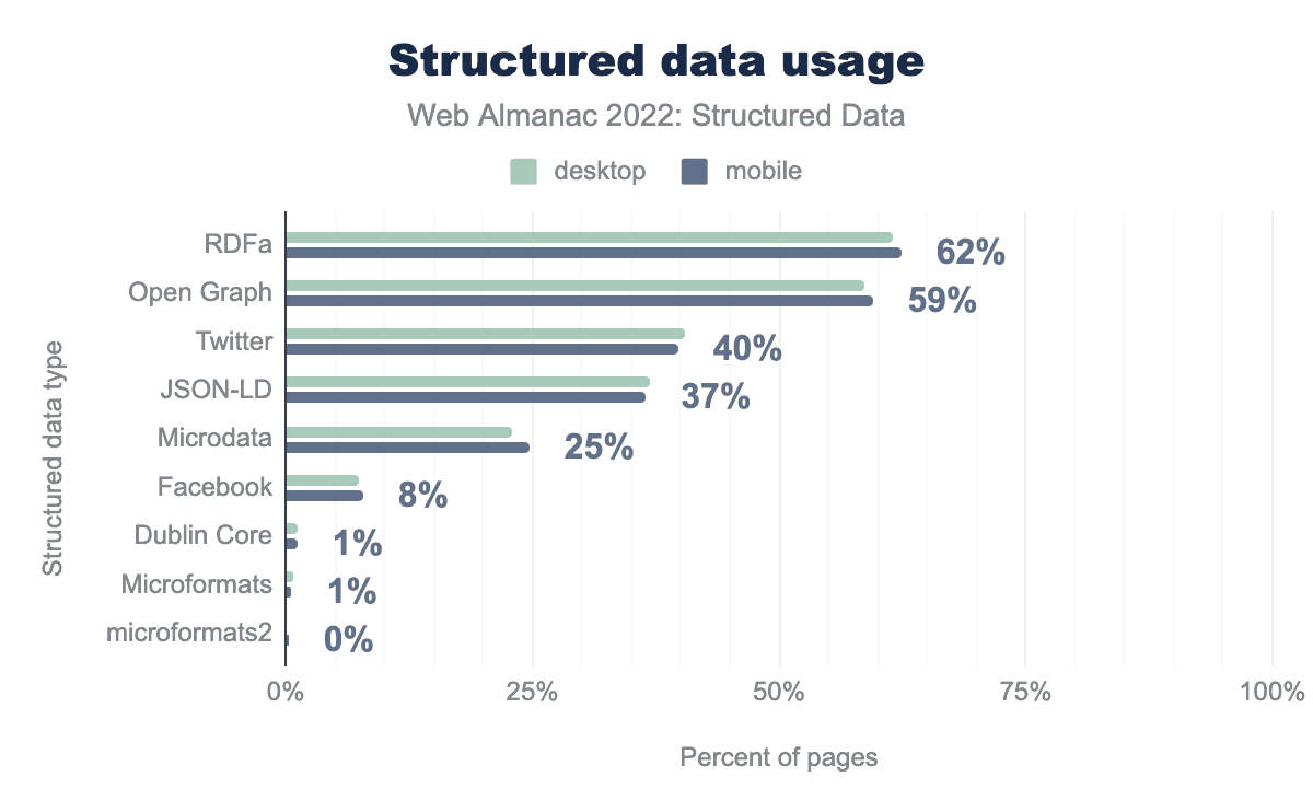 A general increase in these widely-used structured data types can be seen, including Twitter meta tags (which has increased from 37% to 40%) and JSON-LD (which has increased coverage from 34% overall in 2021 to 37% overall in 2022). There is a slight decrease in usage for some of the less prevalent structured data types such as Microdata, Facebook meta tags, Dublin Core and Microformats. Desktop movements were very similar.