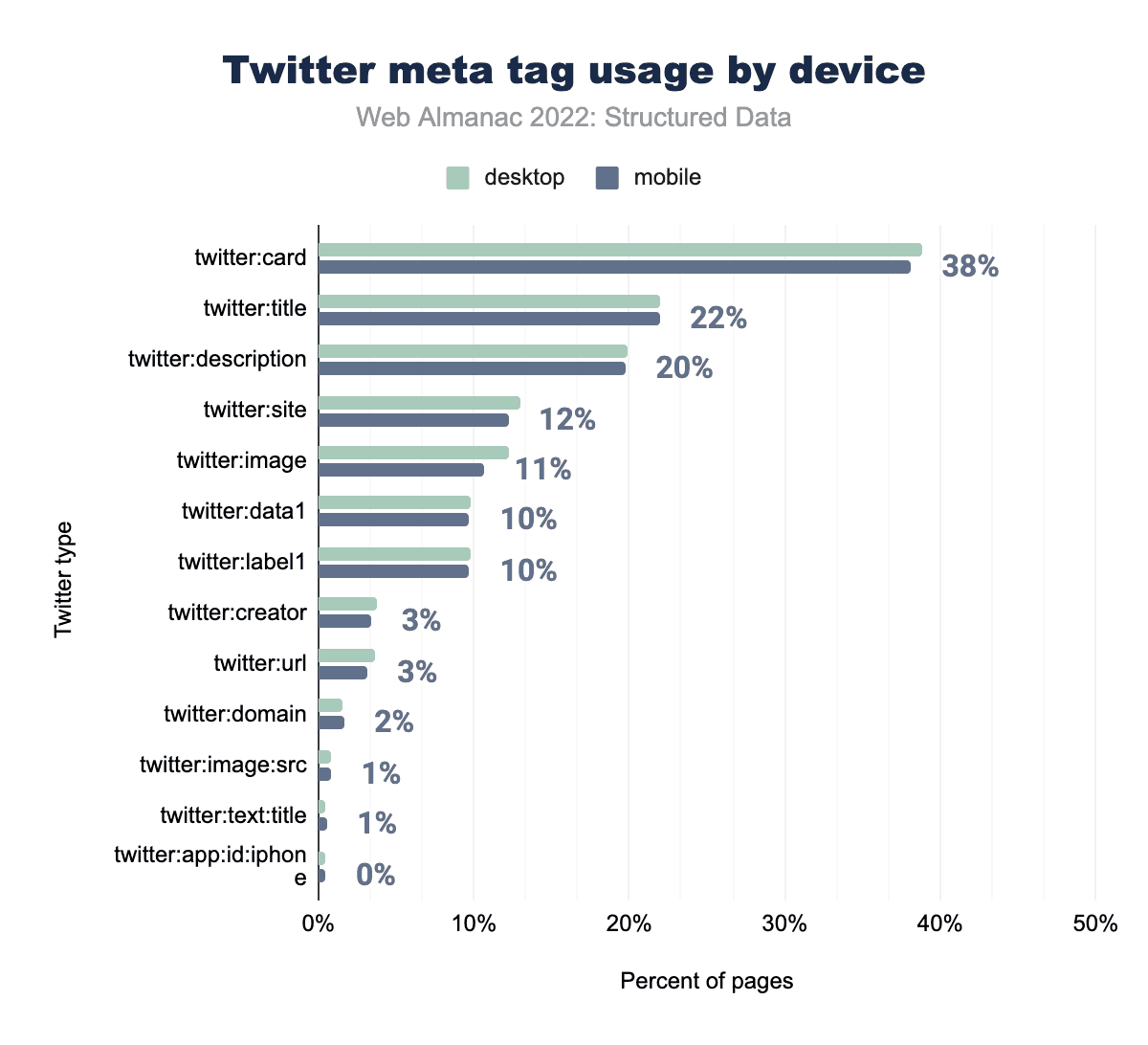 Twitter meta tags once again follow the pattern of a general increase in usage, more specifically in the common tags of twitter:card, twitter:title, twitter:description and twitter:image. A notable increase can be seen for twitter:label1 and twitter:data1, both at 7% in 2021 to 10% in 2022 for mobile pages.