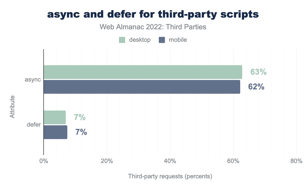 The fact that async is more used demonstrates that third-party scripts are mostly treated as critical resources. Although this is true for some scripts, many third parties, for example, a video player is less critical. Deferred scripts potentially have a better impact on page rendering time which is reflected in core web performance metrics like Largest Contentful Paint. Website developers should consider using defer for third-party assets that are not important for the critical rendering path.