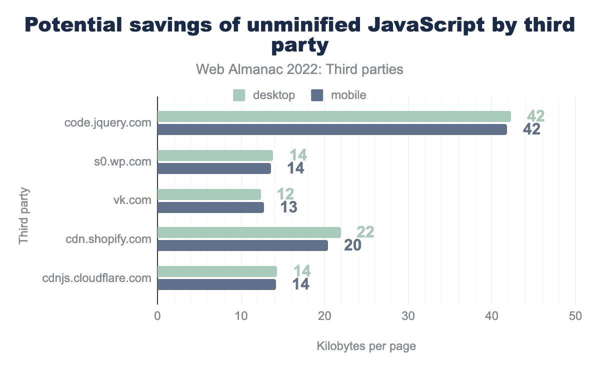 The code.jquery.com CDN library for jQuery is the most popular JavaScript third-party library being used on 6% of all websites on desktop (note that jQuery is used on far more websites, but not all uses are served from this CDN). On average 43 KB of data per page that has unminified jQuery could be saved by using the minified version of its resources, which are available on this CDN.