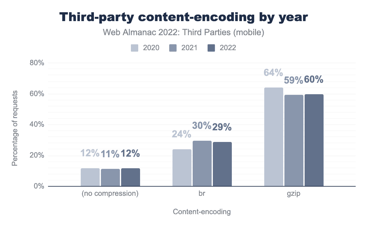 Gzip is still the most popular compression type, i.e. 59% of scripts and 68% of CSS are compressed with Gzip. However, Brotli compression is more effective. The trends among first and third parties show that usage of Brotli compression has grown in the past 3 years, while no compression and Gzip have fallen.