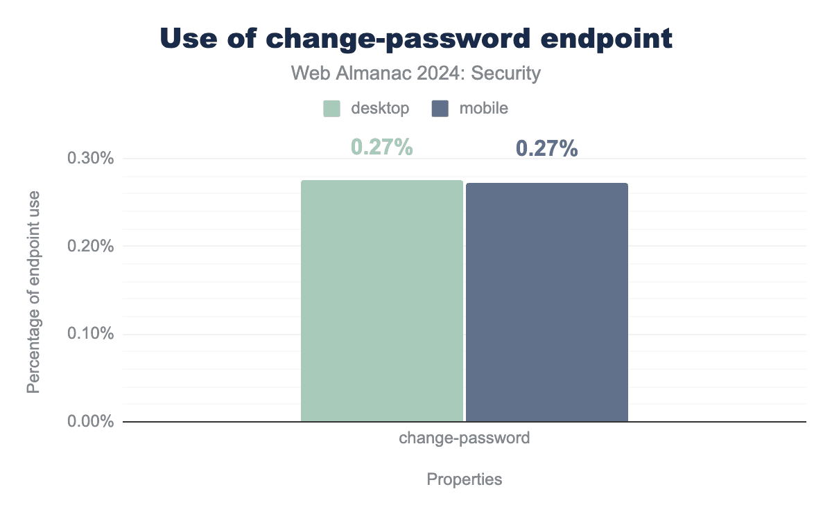 The adoption remains very low. At 0.27% for both mobile and desktop sites it slightly decreased for desktop sites from 0.28% in 2022. Due to the slow standardization process it is not unexpected that the adoption does not change much. We also repeat that websites without authentication mechanisms have no use for this url, which means it would be useless for them to implement it.