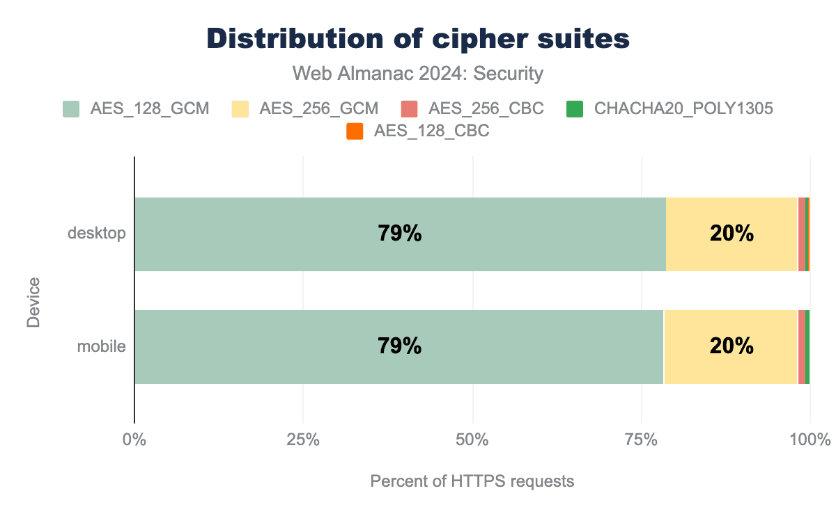 Before client and server can communicate, they have to agree upon the cryptographic algorithms, known as cipher suites, to use. Like last time, over 98% of requests are served using a Galois/Counter Mode (GCM) cipher, which is considered the most secure option, due to them not being vulnerable to padding attacks. Also unchanged is the almost 79% of requests using a 128-bit key, which is still considered a secure key-length for AES in GCM mode. There are only a handful of suites used on the visited pages. TLS1.3 only supports GCM and other modern block cipher modes, which also simplifies its cipher suite ordering.