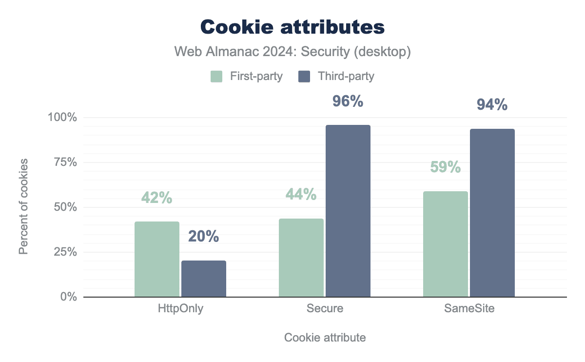 The use of the Secure attribute has been steadily increasing over the years. Since 2022, an additional 7% of cookies in first-party contexts and 6% in third-party contexts have been configured with this attribute. As discussed in previous editions of the Security chapter, the significant difference in adoption between the two contexts is largely due to the requirement that third-party cookies with SameSite=None must also be marked as Secure. This highlights that additional security prerequisites for enabling desired non-default functionality are an effective driver for the adoption of security features.