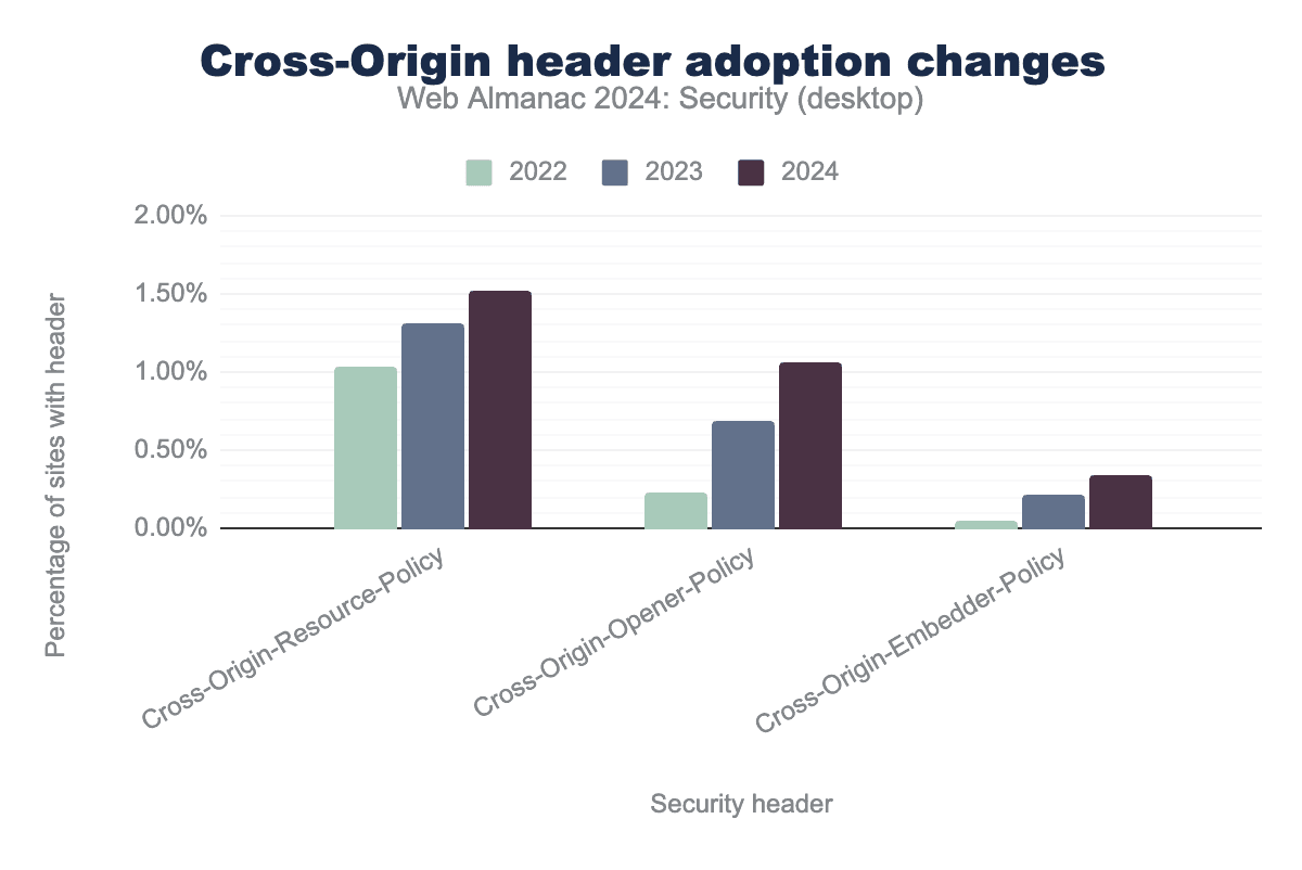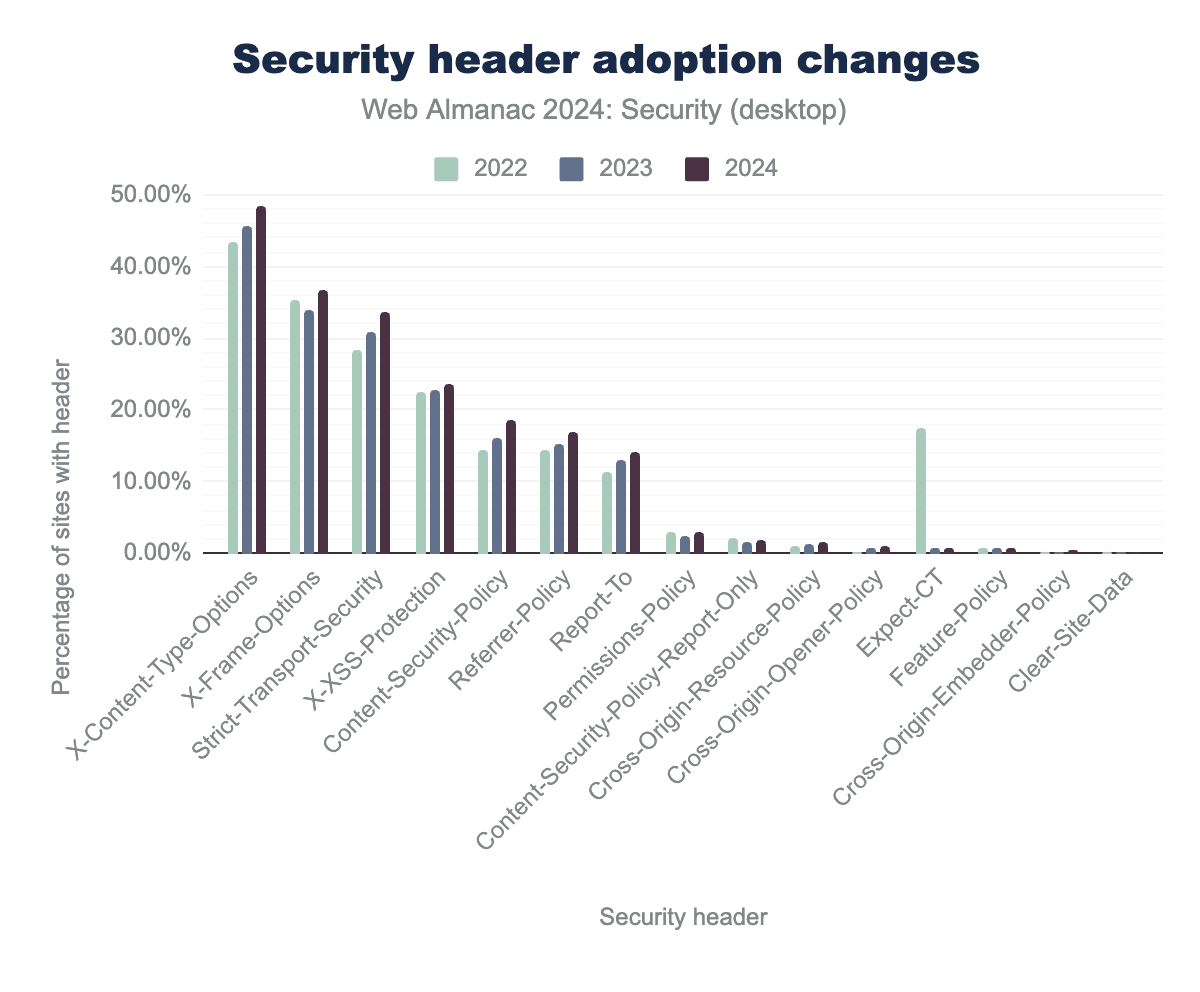 We also investigate the factors driving security practices, analyzing whether elements like country, website category, or technology stack influence the security measures in place. By comparing this year’s findings with those from the 2022 Web Almanac, we highlight key changes and assess long-term trends. This allows us to provide a broader perspective on the evolution of web security practices and the progress made over the years.