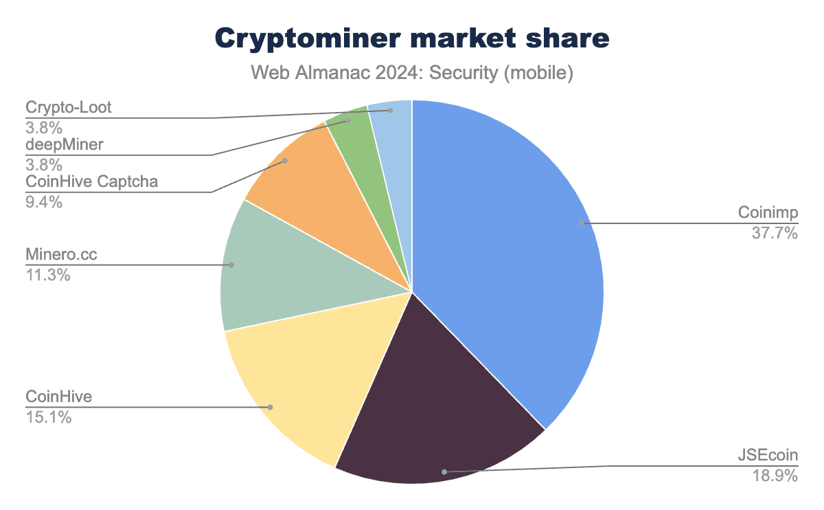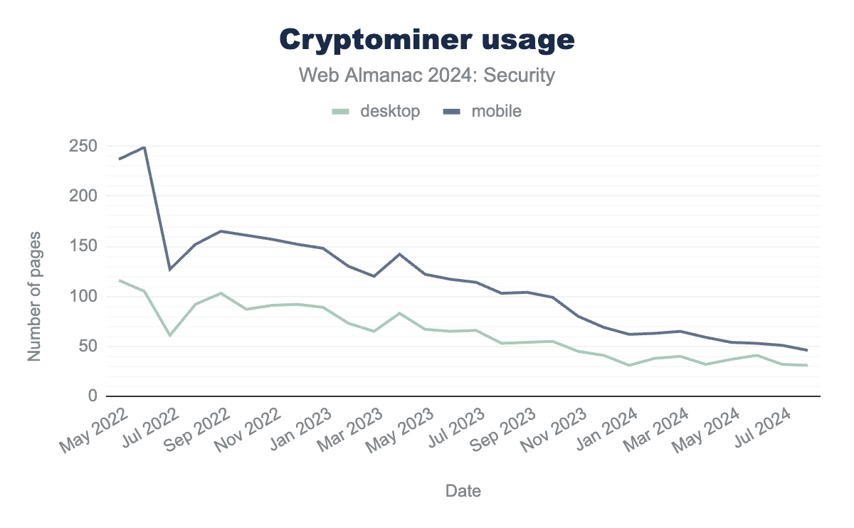 Although cryptocurrencies remain popular, the number of cryptominers on the web has continued to decrease over the past two years, with no notable spikes in usage anymore as was described in the 2022 edition of the Web Almanac.