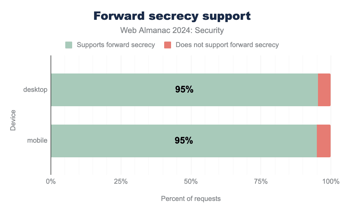 TLS1.3 makes forward secrecy required, which means it is highly supported on the web. Forward Secrecy is a feature that assures that in case a key in use is leaked, it cannot be used to decrypt future or past messages sent over a connection. This is important to ensure that adversaries storing long-term traffic cannot decrypt the entire conversation as soon as they are able to leak a key. Interestingly, the use of forward secrecy dropped by almost 2% this year, to 95%.