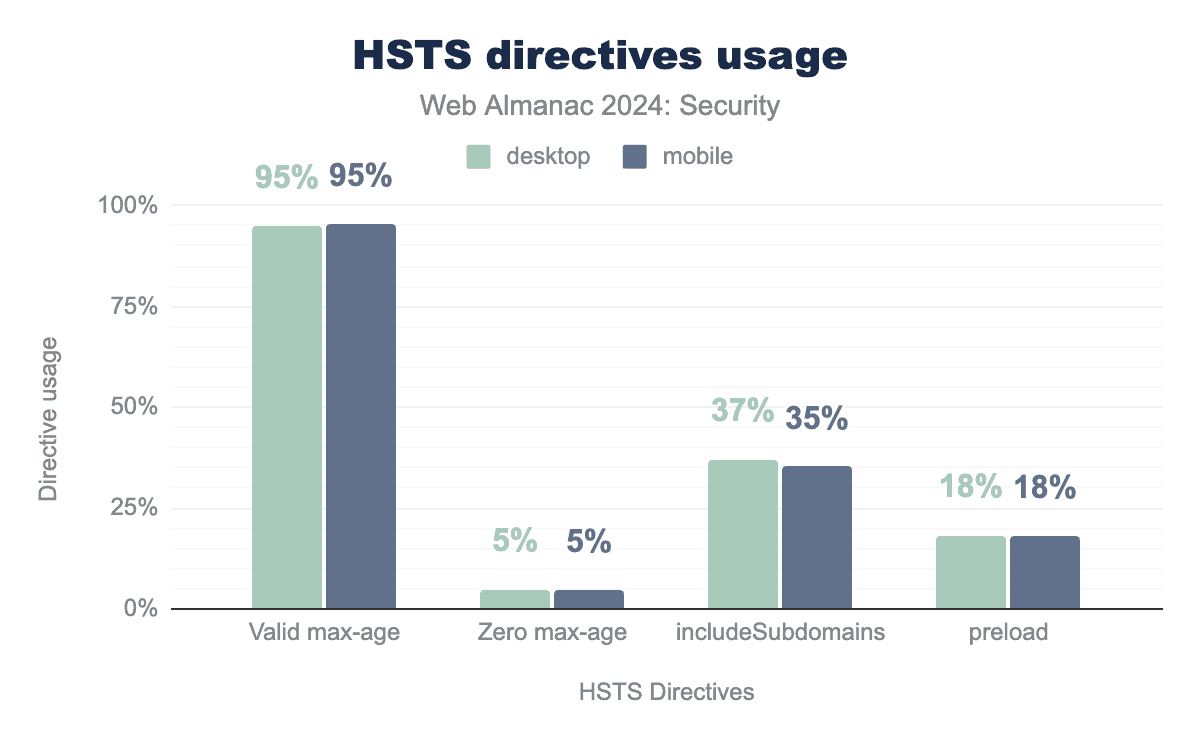 The share of requests with a valid max-age has remained unchanged at 95%. The other , optional, directives (includeSubdomains and preload) both see a slight increase of 1% compared to 2022 to 35% and 18% on mobile respectively. The preload directive, which is not part of the HSTS specification, requires the includeSubdomains to be set and also requires a max-age larger than 1 year (or 31,536,000 seconds).