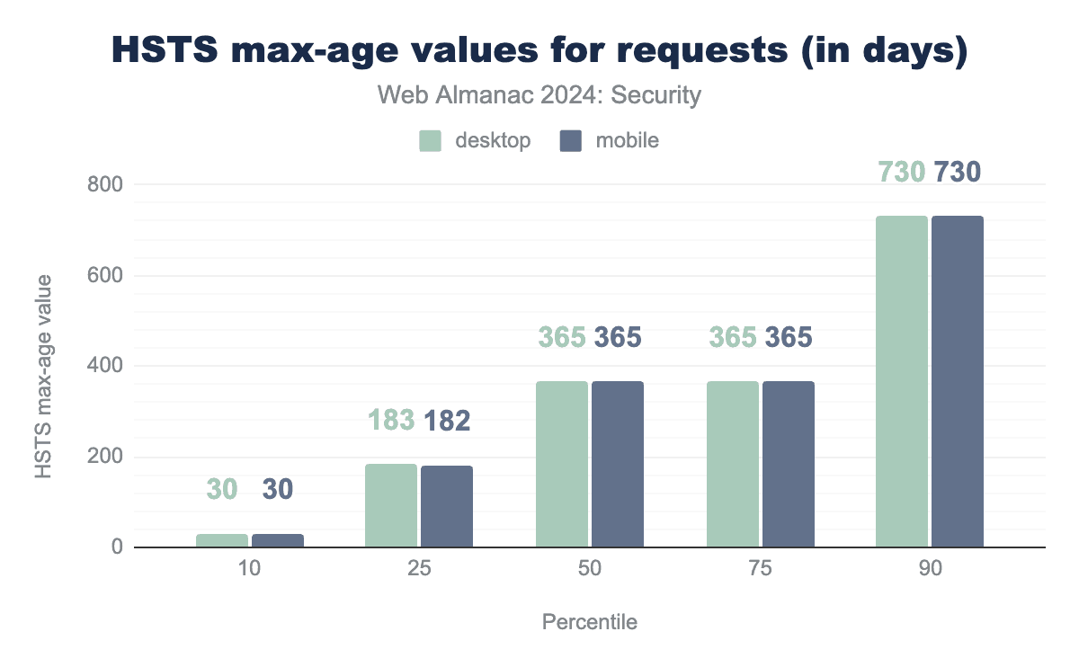 The distribution of valid max-age values has remained almost the same as in 2022, with the exception that the 10th percentile on mobile has decreased from 72 to 30 days. The median value of max-age remains at 1 year.