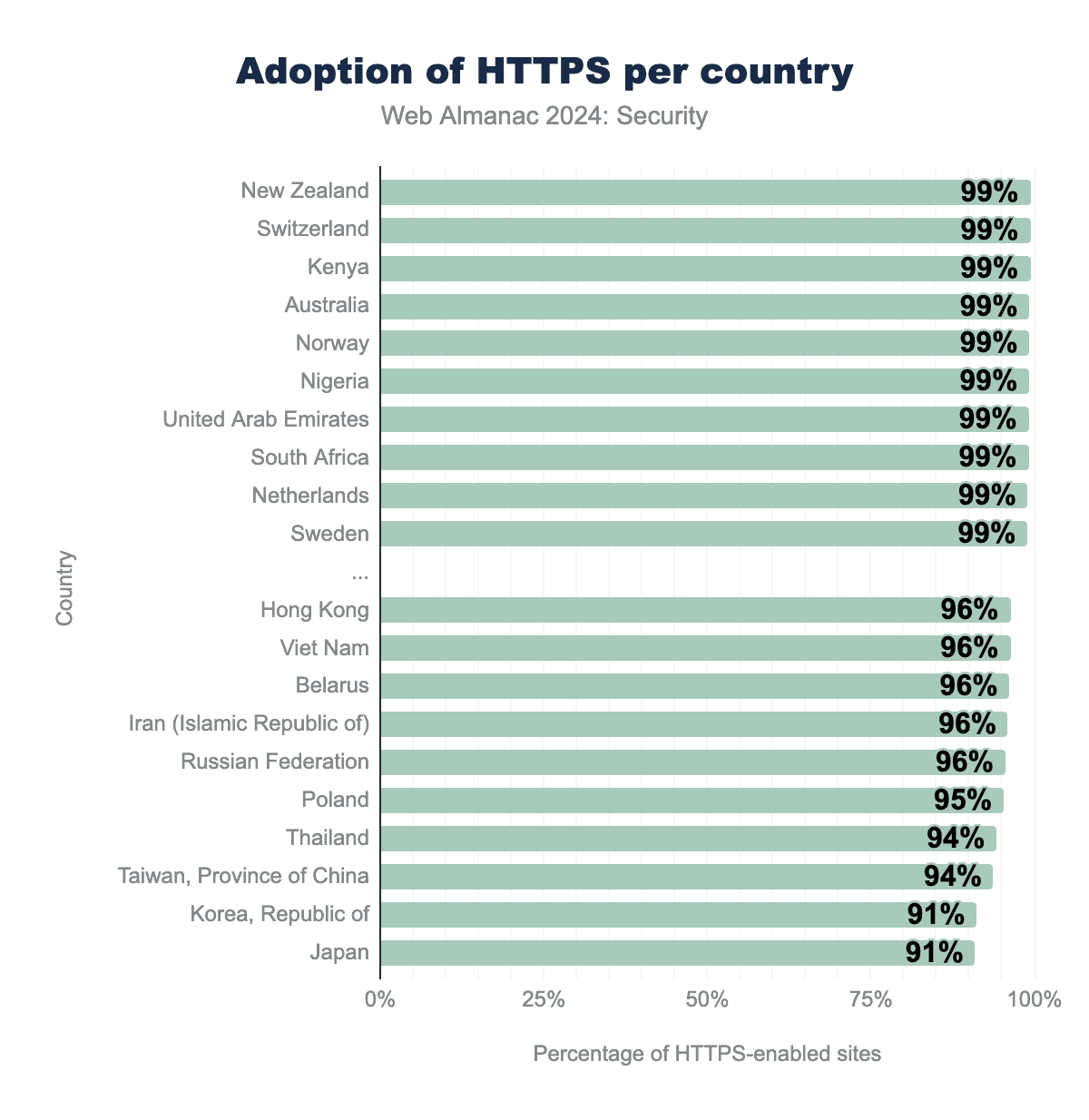 HTTPS uses Transport Layer Security (TLS) to secure the connection between client and server. Over the past years, the number of sites using TLS has increased tremendously. As in previous years, adoption of TLS continued to increase, but that increase is slowing down as it closes in to 100%.
