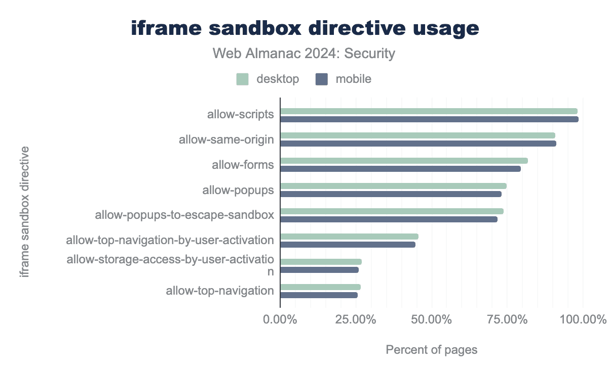 Although the Content Security Policy can be defined using a <meta> tag, its frame-ancestors and sandbox directives are not supported in this context. Despite this, our observations show that 1.70% of pages that use CSP in a <meta> tag on desktop and 1.26% on mobile incorrectly used the frame-ancestors directive in the <meta> tag. This is far lower for the disallowed sandbox directive, which was defined for less than 0.01%.