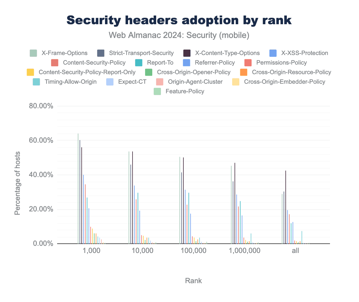 Figure 11.45. Security header adoption by website rank according to the April 2024 CrUX.