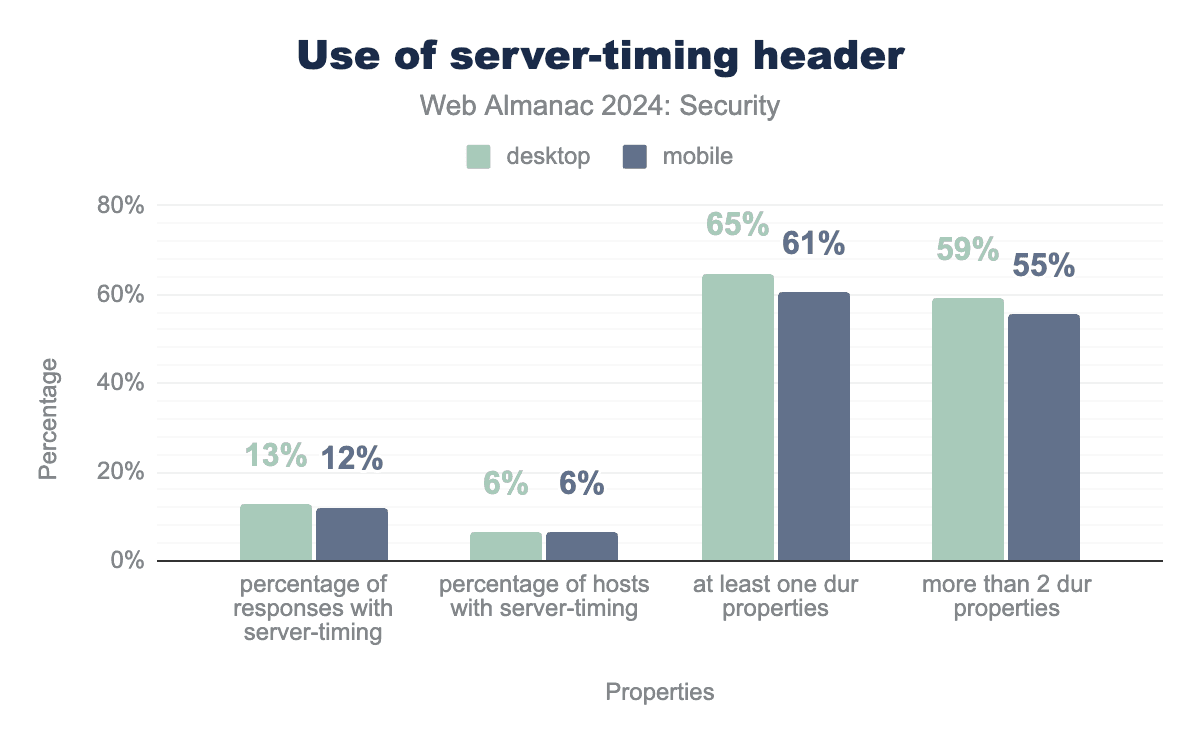 We find that server-timing is used by 6.4% of internet hosts. Over 60% of those hosts include at least one dur property in their response and over 55% even send more than two. This means that these sites are exposing server-side process durations directly to a client, which can be used for exploiting. Because the server-timing may contain sensitive information, the use is now restricted to the same origin, except when Timing-Allow-Origin is used by the developer as discussed in the previous section. However, timing attacks can still be exploited directly against servers without the need to access cross-origin data.