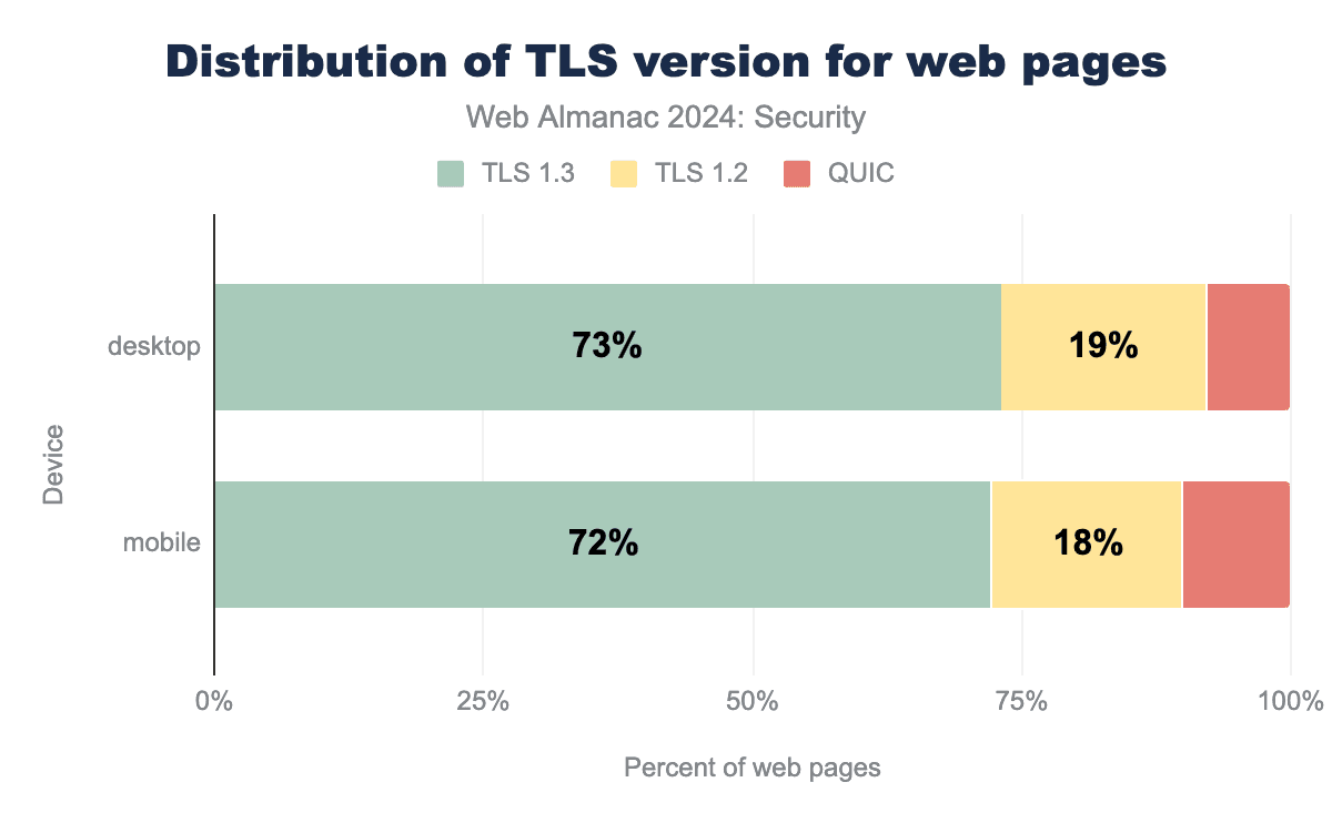 We find that TLS1.3 is supported and used by 73% of web pages. The use of TLS1.3 overall has grown, even though QUIC has gained significant use compared to 2022, moving from 0% to almost 10% of mobile pages. The use of TLS1.2 continues to decrease as expected. Compared to the last Almanac it decreased by more than 12% for mobile pages, while TLS1.3 has increased by a bit over 2%. It is expected that the adoption of QUIC will continue to rise, as the use of TLS1.2 will continue to decrease.