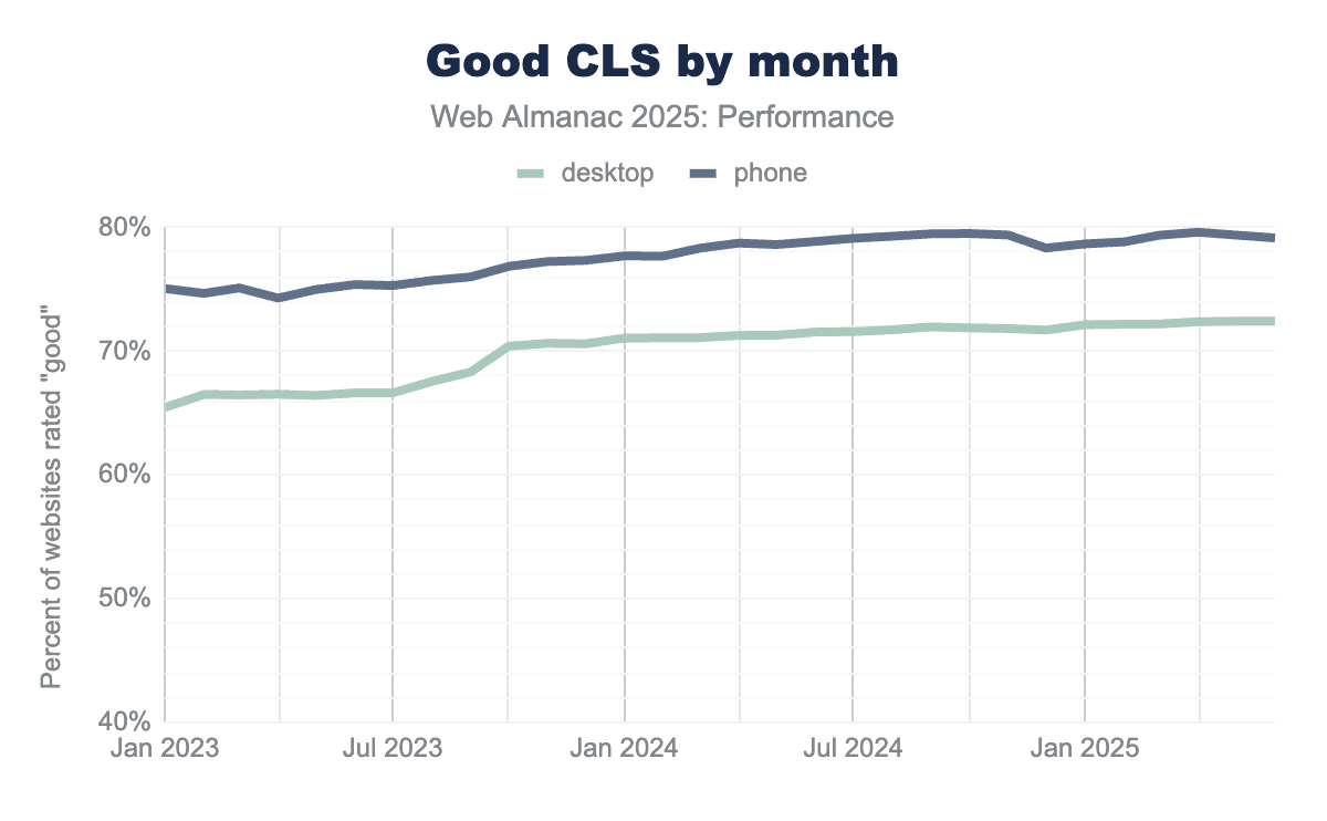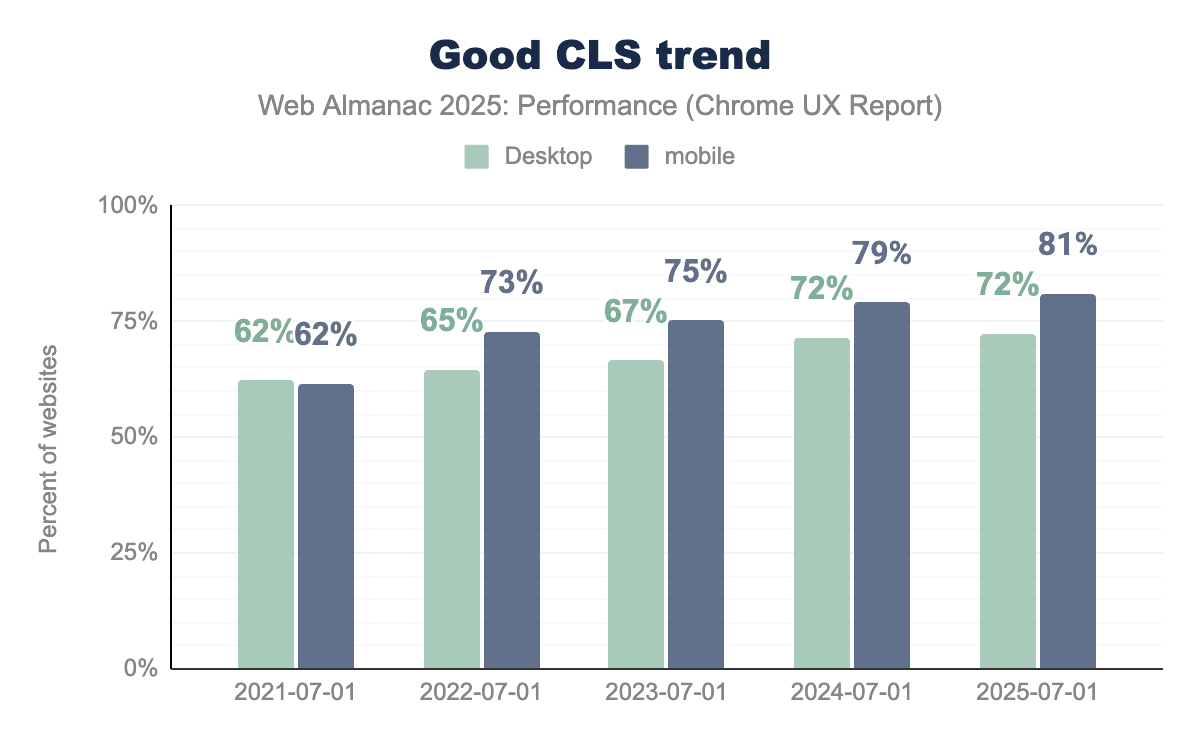 Compared to 2024, the share of desktop pages with “poor” CLS decreased by 1%, with a similar increase in pages classified as “needs improvement”.