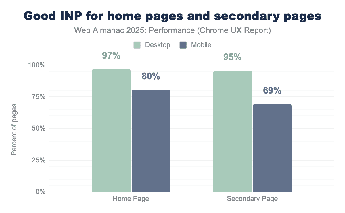 Pages beyond the homepage show slightly better visual stability than homepages across both desktop and mobile devices when looking at page-level CrUX data. In 2025, 73% of desktop secondary pages achieve “good” CLS compared to 71% of desktop homepages, while on mobile 81% of secondary pages meet the “good” CLS threshold versus 79% of mobile homepages. This suggests that homepages, which often contain more dynamic content such as hero media, banners, and promotional elements, remain more prone to layout shifts than secondary pages.